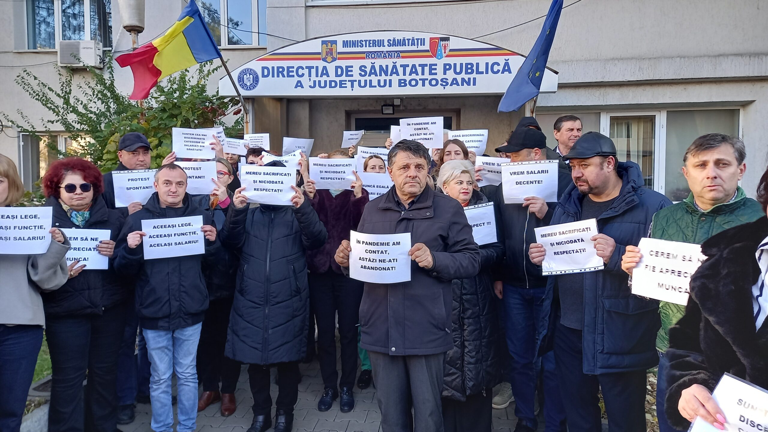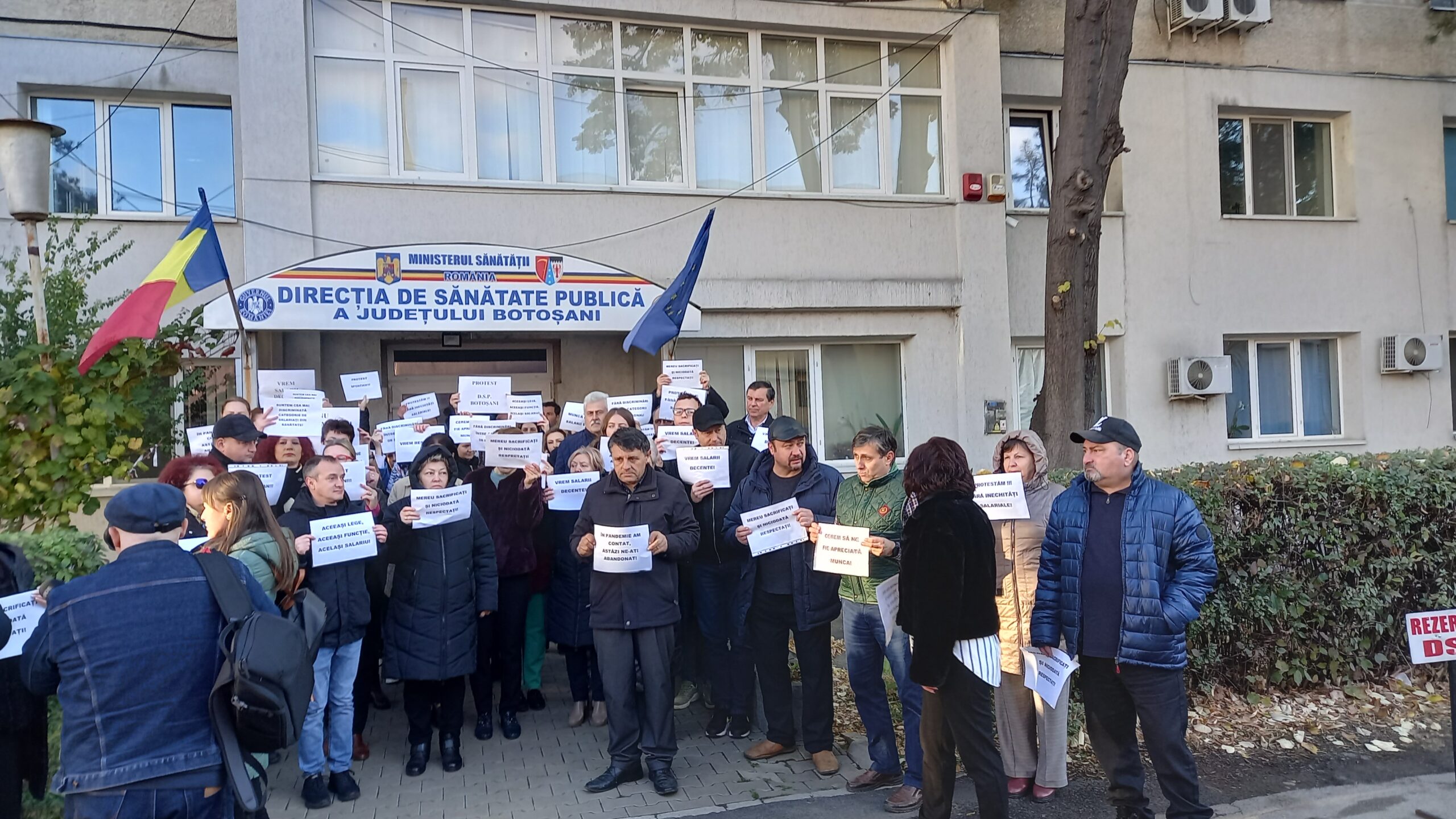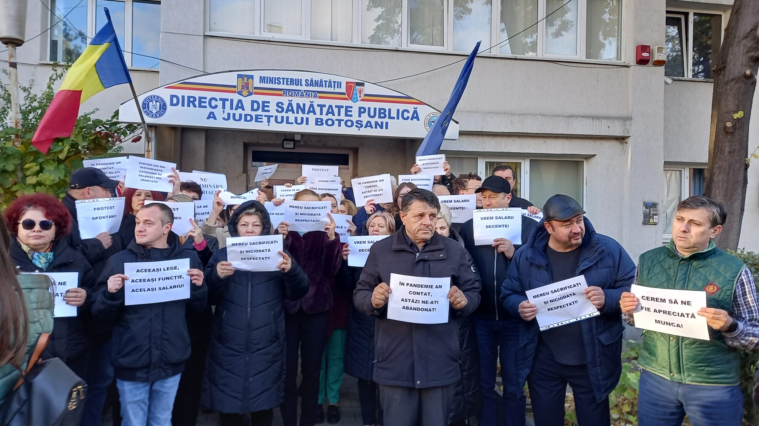 Peste 80 de salariați din Direcția de Sănătate Publică Botoșani au protestat, astăzi, în fața instituției pentru salarii mai mari. Protestul a avut loc între orele 8,30 – 9,30, salariații purtând pancarte cu mesajele ”Aceeasi lege, aceeași funcție, același salariu!”, ”Vrem salarii decente!”, ”În pandemie am contat, astăzi ne-ați abandonat!”, ”Mereu sacrificați și niciodată respectați”