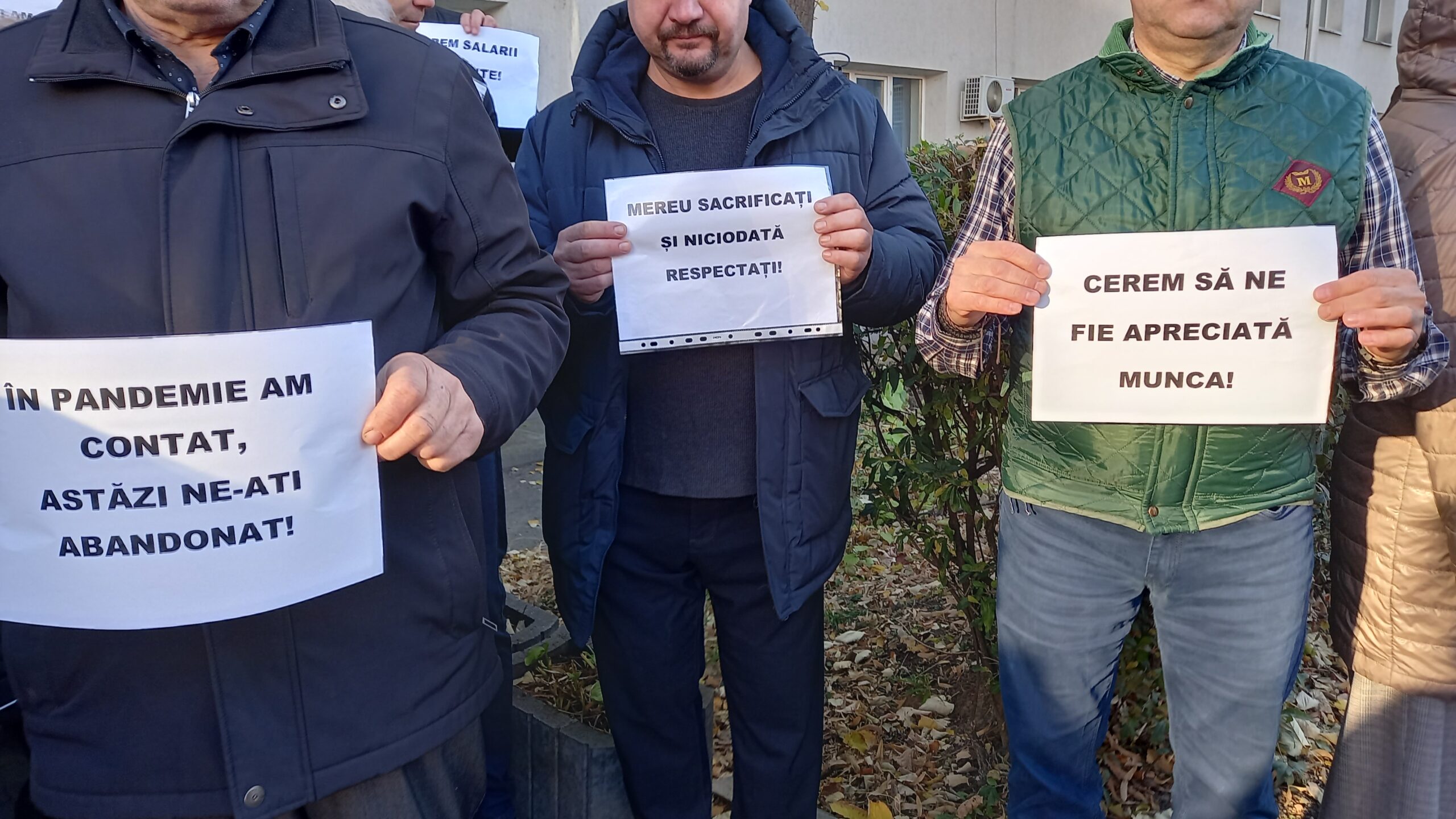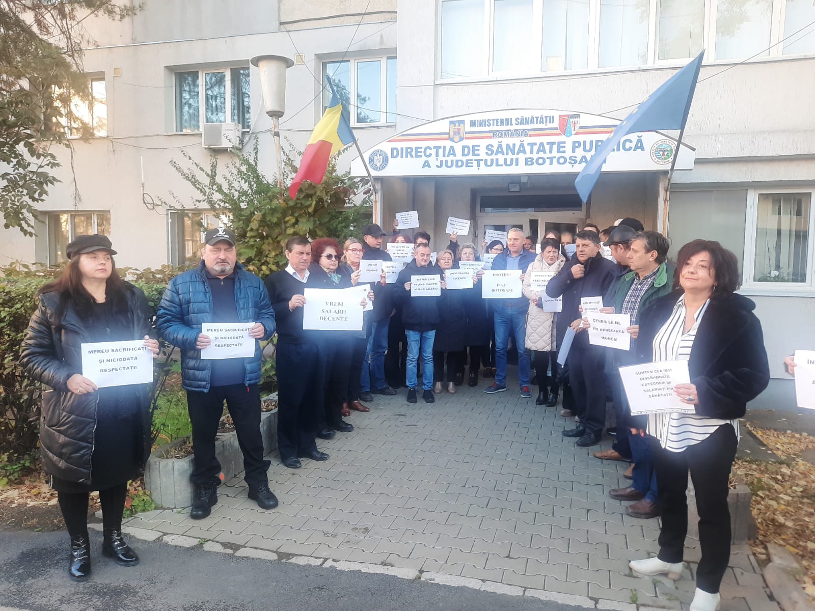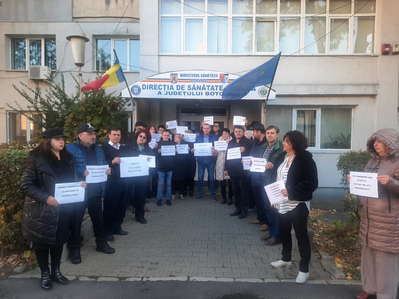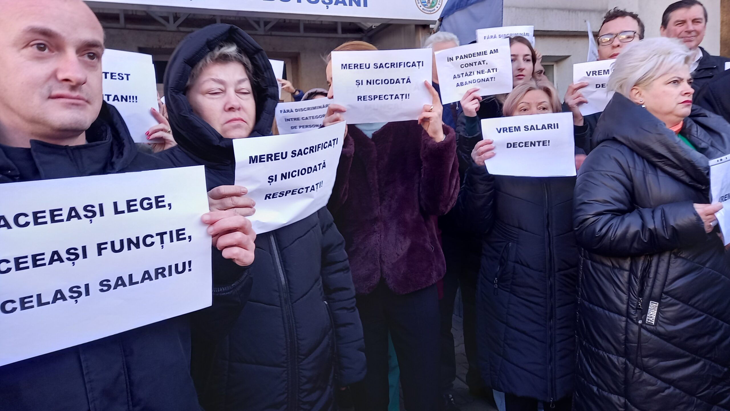 Peste 80 de salariați din Direcția de Sănătate Publică Botoșani au protestat, astăzi, în fața instituției pentru salarii mai mari. Protestul a avut loc între orele 8,30 – 9,30, salariații purtând pancarte cu mesajele ”Aceeasi lege, aceeași funcție, același salariu!”, ”Vrem salarii decente!”, ”În pandemie am contat, astăzi ne-ați abandonat!”, ”Mereu sacrificați și niciodată respectați”
