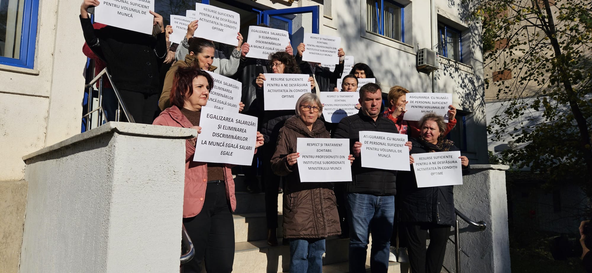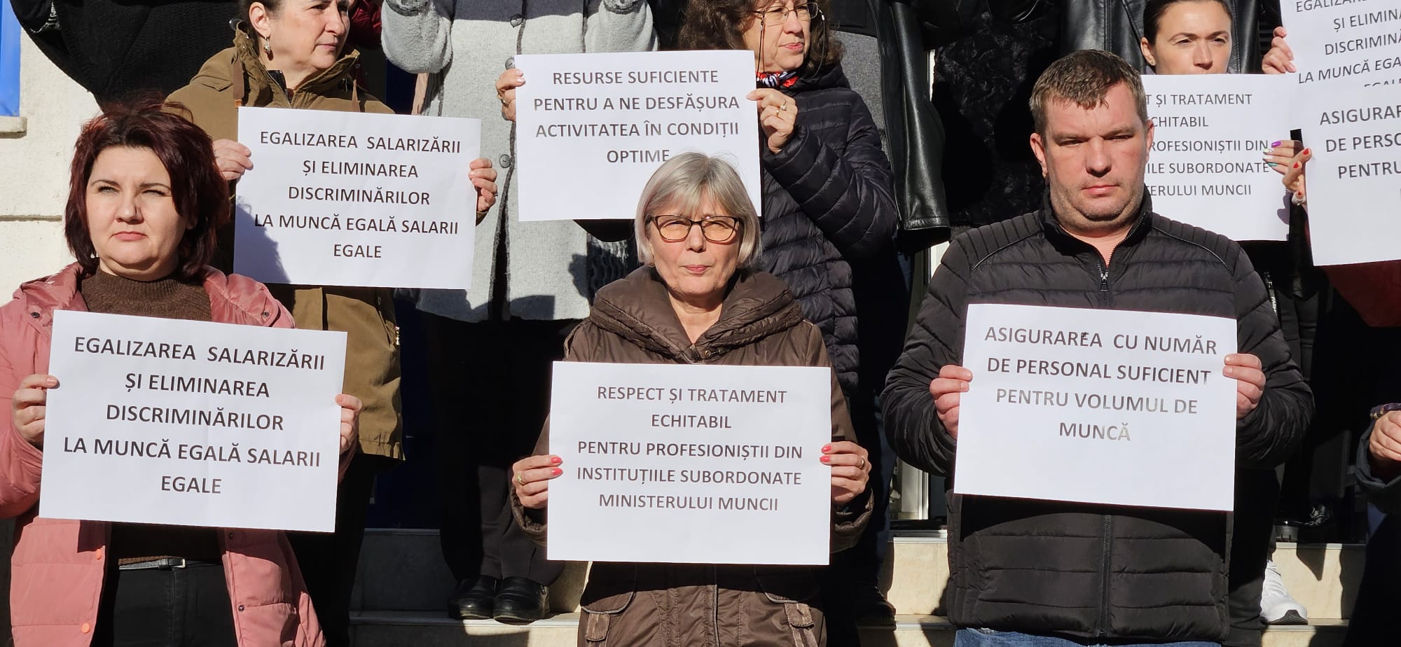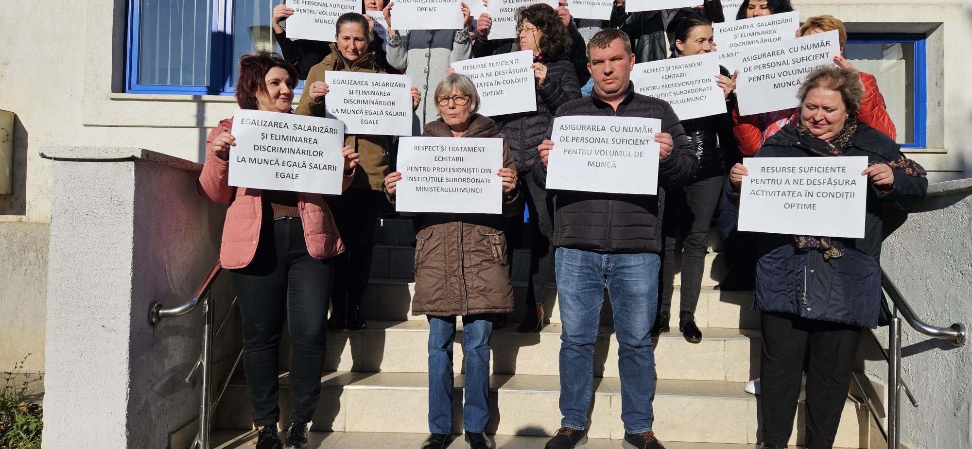 Ei au purtat pacarte cu mesajele: ”Respect și tratament echitabil pentru profesioniștii din instituțiile subordonate Ministerului Muncii!”, ”Egalizarea salarizării și eliminarea discriminărilor /La muncă egală salarii egale!”, ”Asigurarea cu număr de personal suficient pentru volumul de muncă!”.