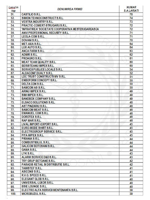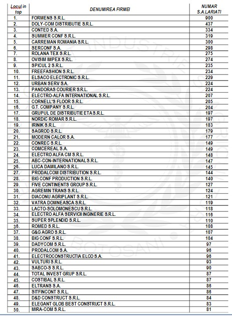 Pe prima poziţie se află fabrica de confecţii Formens, a francezului Gerard Losson, care are 900 de salariaţi. Pe locul trei se află fabrica de confecţii Conted din Dorohoi, cu 334 salariaţi, iar pe patru Summer Conf, cu 319 angajaţi.