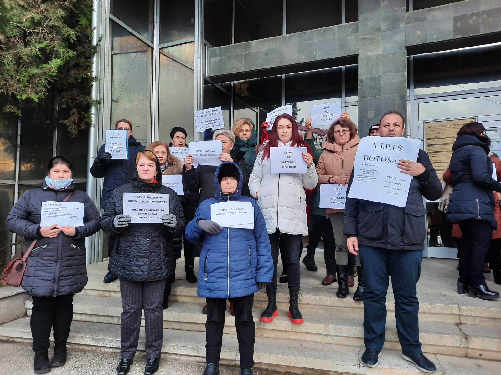 Și angajații Agenției Județene pentru Plăți și Inspecție Socială Botoșani au întrerupt lucrul, astăzi, timp de două ore, protestând în fața unității.