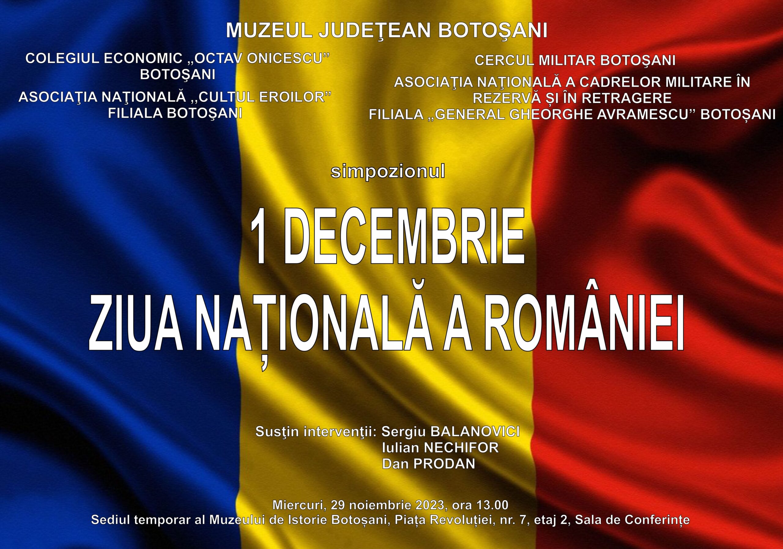 Muzeul Județean Botoșani organizează miercuri, 29 noiembrie 2023, ora 13.00, la sediul temporar al Muzeului de Istorie Botoșani (Piața Revoluției, nr. 7, et. 2), Sala de Conferințe, simpozionul „1 Decembrie – Ziua Națională a României”. Susțin intervenții: Sergiu Balanovici, Iulian Nechifor și Dan Prodan.