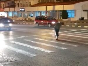 Imagini care i-a lăsat muți de uimire pe câțiva șoferi, dar și pietoni, au fost surprinse chiar în centrul municipiului Botoșani. Un tânăr deghizat într-o bătrânică care abia merge, ajutându-se de un toiag, traversează pe trecerea de pietoni din zona Pieței Centrale, în timp ce șoferii așteaptă la culoarea roșie a semaforului.