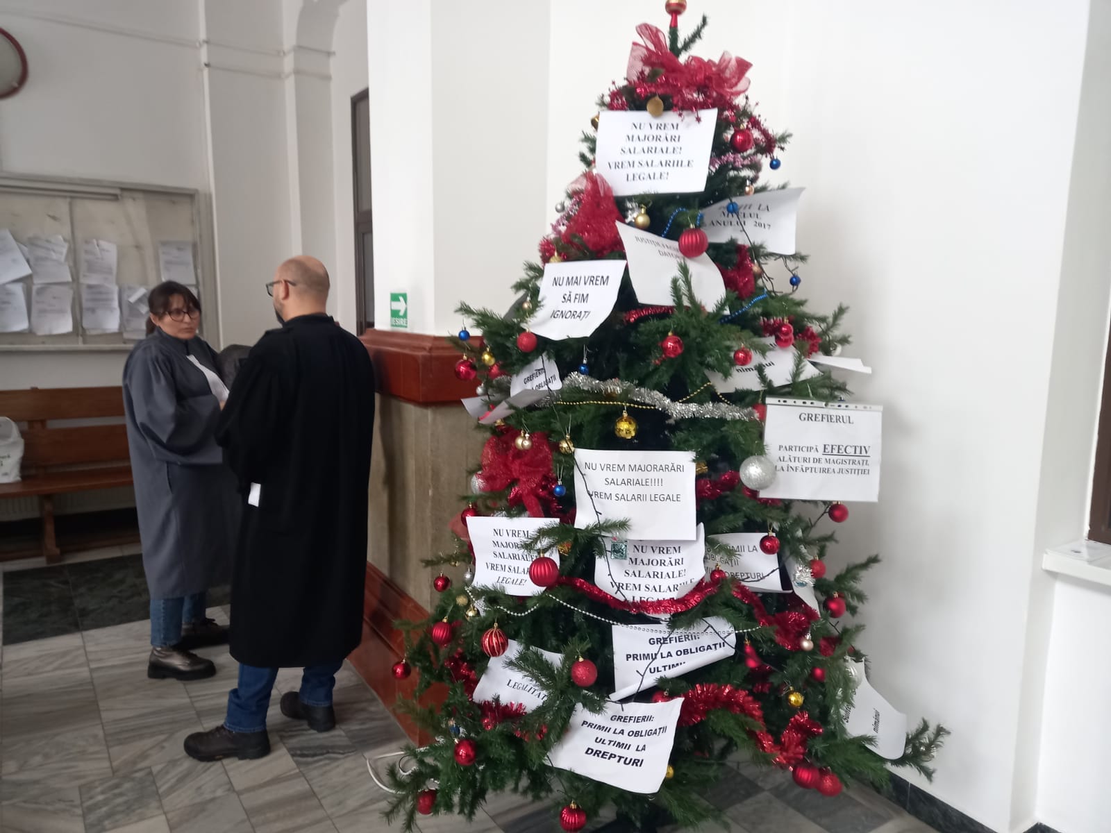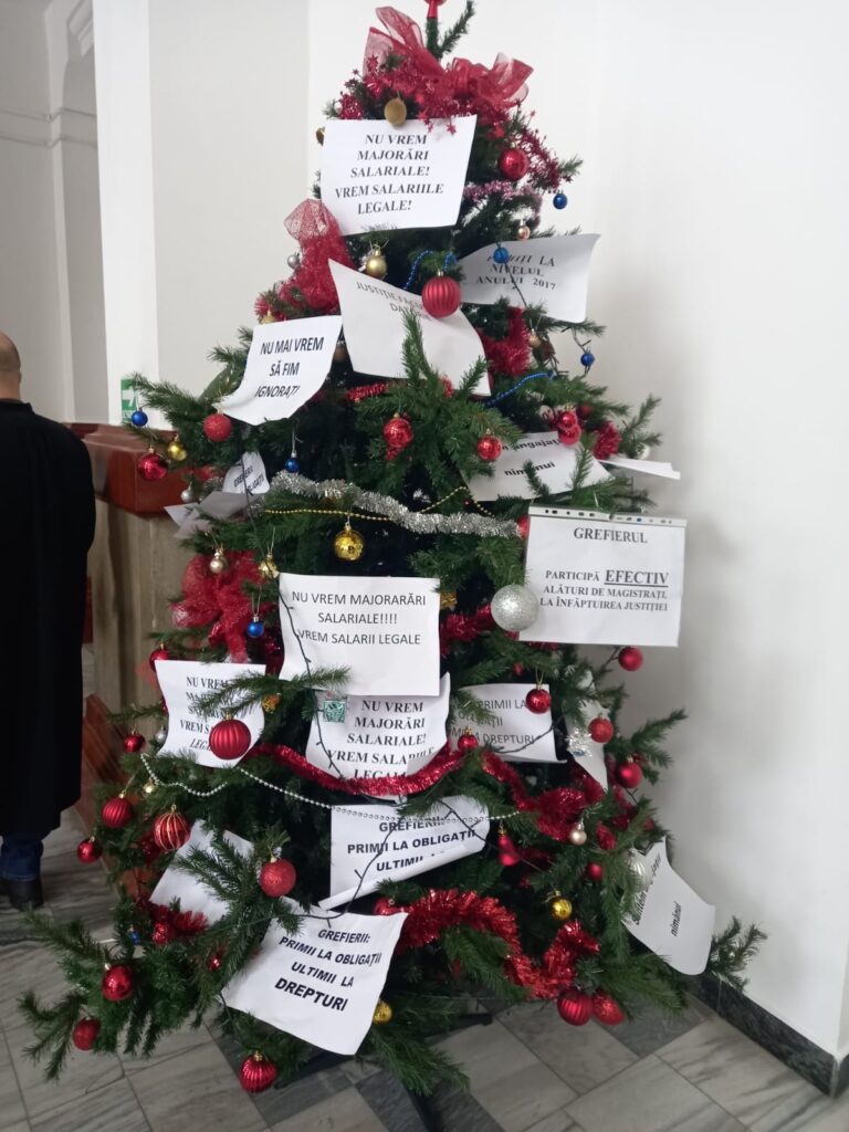 Bradul de Crăciun a fost „împodobit” cu mesaje de nemulțumire într-o instituție din județul Botoșani. Grefierii din cadrul Judecătoriei Botoșani, care au protestat vineri, în fața instituției, au înlocuit o parte din globurile din pom cu mesajele lor de nemulțumire.