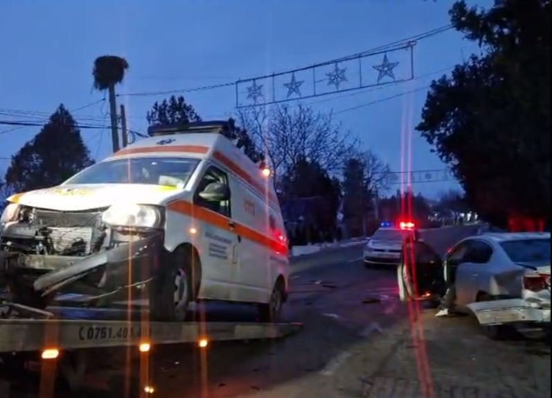În urma impactului violent ambulanța a fost avariată în partea din față, în timp ce autoturismul Volkswagen a fost lovit în partea din stânga spate și rotit la 180 de grade pe șosea.