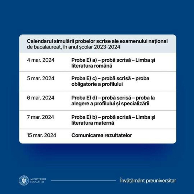 „A fost aprobat şi trimis spre publicare ordinul privind organizarea simulării evaluării naţionale pentru absolvenţii clasei a VIII-a şi a simulării probelor scrise ale examenului naţional de bacalaureat, în anul şcolar 2023-2024! Listele cuprinzând conţinuturile pentru simularea Evaluării Naţionale pentru clasa a VIII-a şi pe cele pentru simularea examenului de bacalaureat sunt anexe ale acestui ordin şi vor fi transmise după publicarea în Monitorul Oficial”, a transmis, marţi, Ministerul Educaţiei.