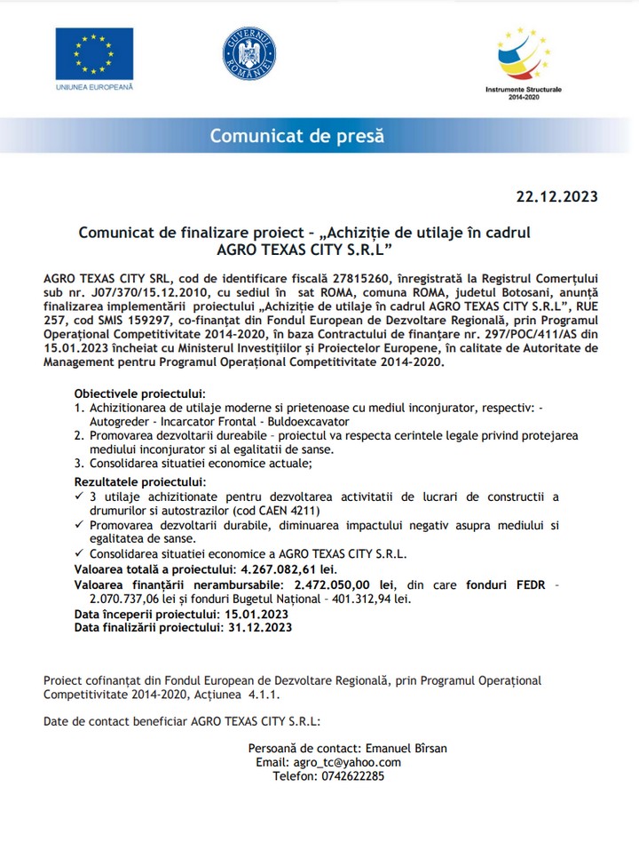 AGRO TEXAS CITY SRL, cod de identificare fiscală 27815260, înregistrată la Registrul Comerțului sub nr. J07/370/15.12.2010, cu sediul în  sat ROMA, comuna ROMA, judetul Botosani, anunță finalizarea implementării  proiectului„Achiziție de utilaje în cadrul AGRO TEXAS CITY S.R.L”, RUE 257, cod SMIS 159297, co-finanţat din Fondul European de Dezvoltare Regională, prin Programul Operațional Competitivitate 2014-2020, în baza Contractului de finanţare nr. 297/POC/411/AS din 15.01.2023 încheiat cu Ministerul Investițiilor și Proiectelor Europene, în calitate de Autoritate de Management pentru Programul Operațional Competitivitate 2014-2020.