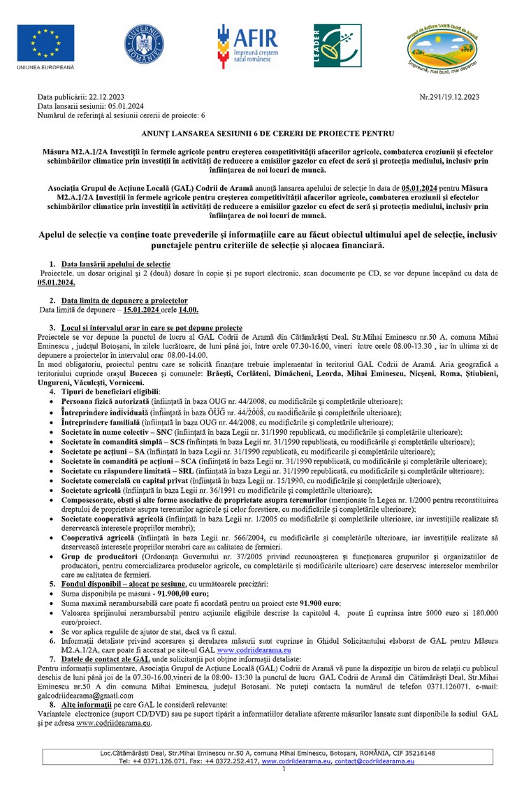 Asociația Grupul de Acţiune Locală (GAL) Codrii de Aramă anunţă lansarea apelului de selecţie în data de 05.01.2024 pentru Măsura M2.A.1/2A Investiții în fermele agricole pentru creșterea competitivității afacerilor agricole, combaterea eroziunii și efectelor schimbărilor climatice prin investiții în activități de reducere a emisiilor gazelor cu efect de seră și protecția mediului, inclusiv prin înființarea de noi locuri de muncă.