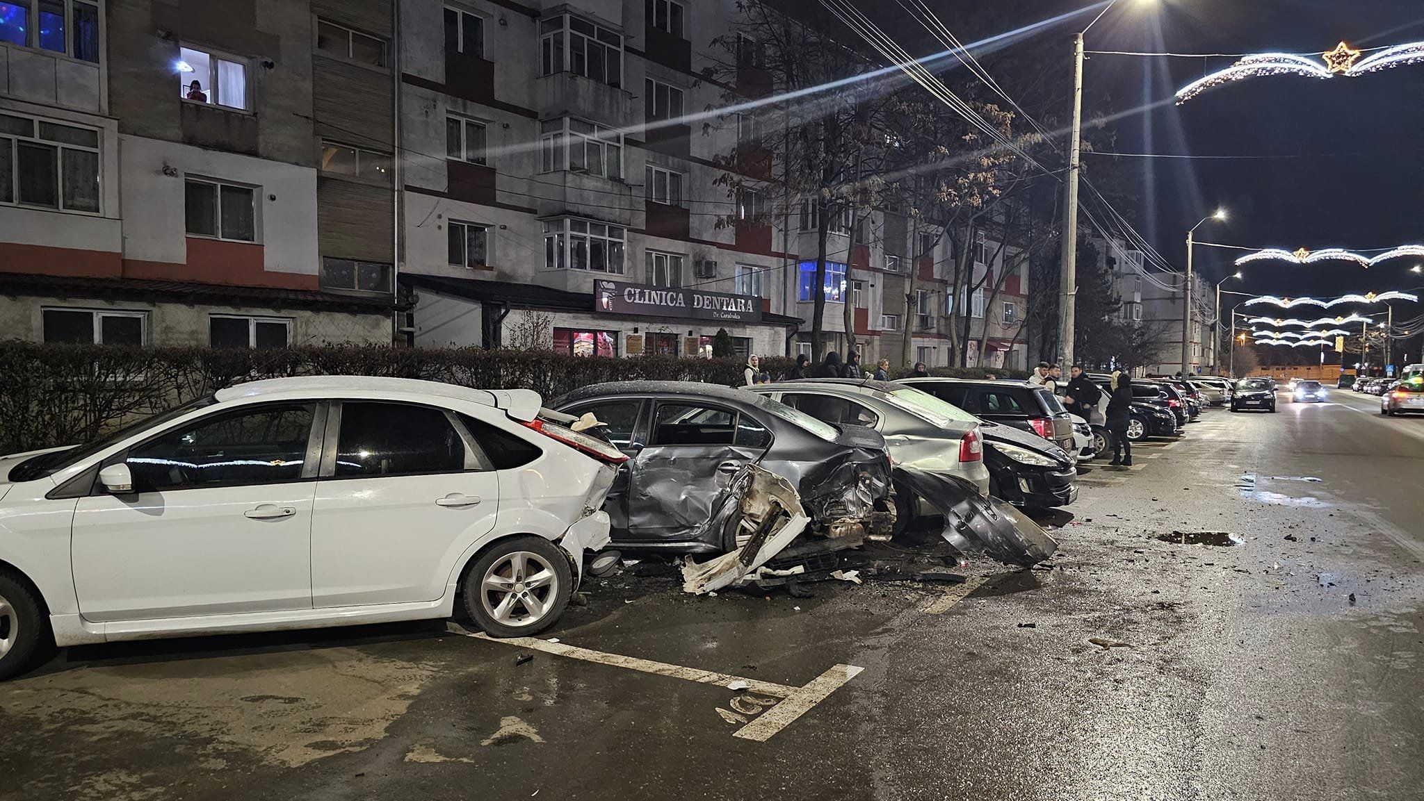 Patru dintre maşini erau parcate pe porţiunea de stradă cuprinsă între Prieteniei şi Sucevei, în zona magazinului Profi. Una dintre ele a fost lovită violent de un autoturism al cărui şofer circula cu viteză şi care a pătruns pe contrasens. Ulterior, alte trei maşini parcate au fost avariate.
