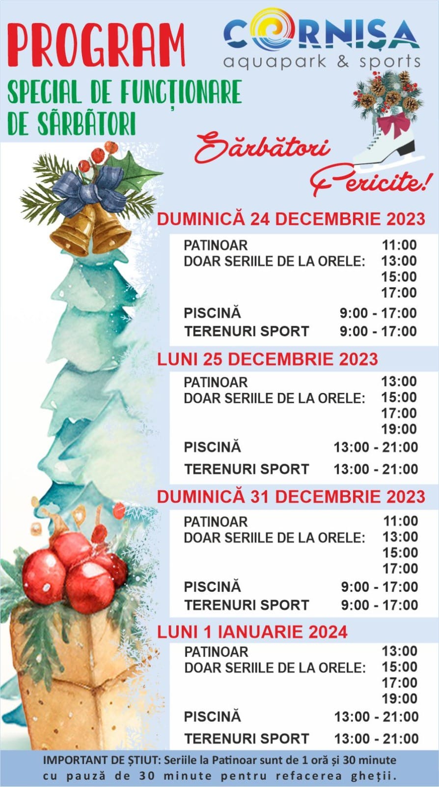 Botoșănenii, și nu numai, care nu și-au făcut încă programul pentru Crăciun pot alege să petreacă alături de cei dragi la Cornișa Aquapark. De sărbători, va fi un program special. În prima zi de Crăciun, pe 25 decembrie, va fi deschis de la ora 13.00, inclusiv la piscină și patinoar.