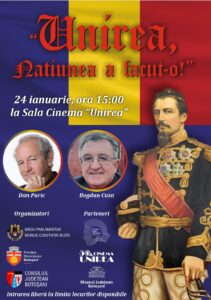 Biroul parlamentar al președintelui Comisiei pentru administrație publică și amenajarea teritoriului din Camera Deputaților, Marius Constantin Budăi, Consiliul Județean Botoșani și Primăria Municipiului Botoșani vă invită miercuri, 24 ianuarie, de la ora 15:00, la Sala Cinema Unirea, la evenimentul „UNIREA, NAȚIUNEA A FĂCUT-O!”.