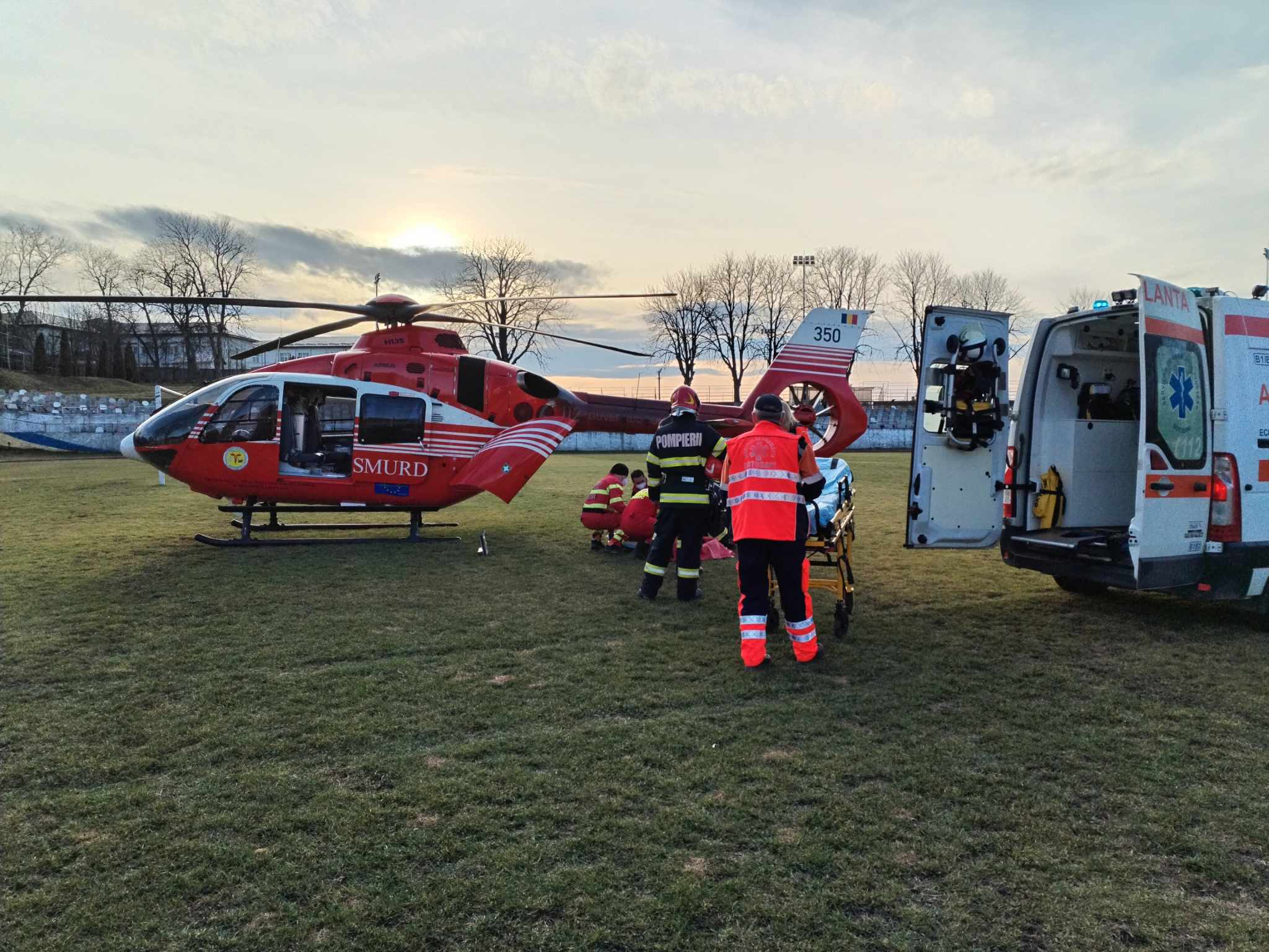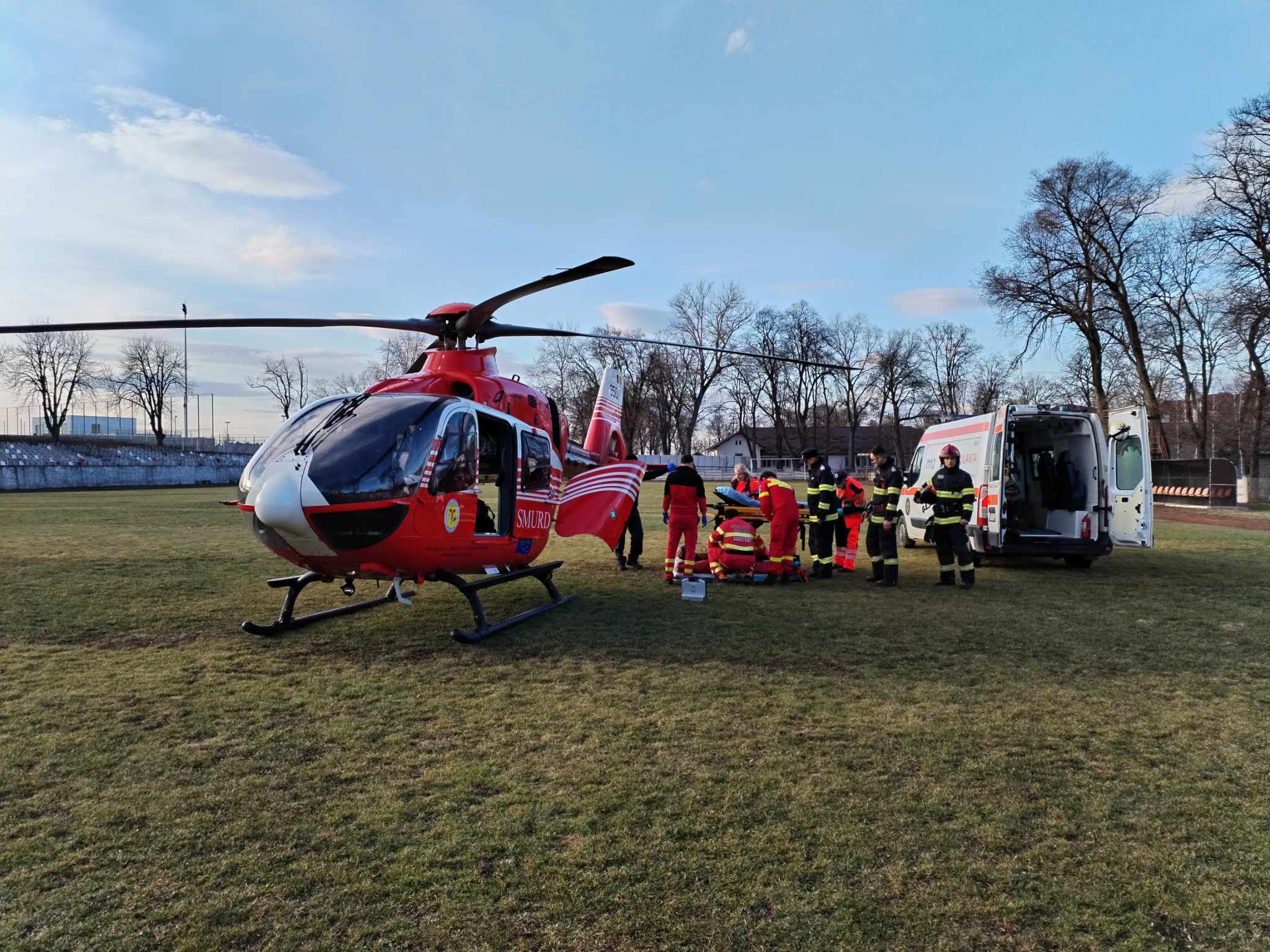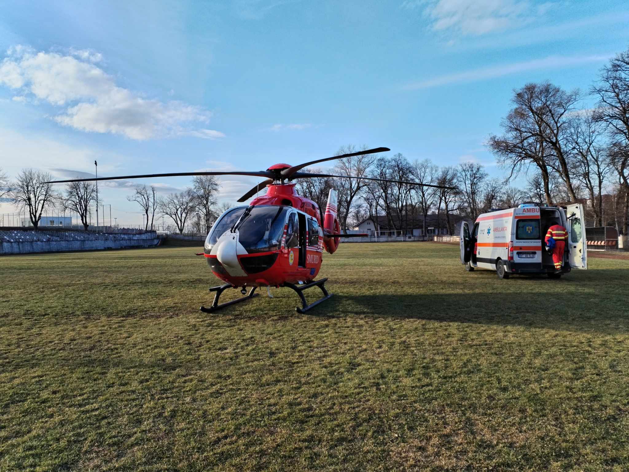 Elicopterul SMURD a aterizat pe Stadionul Dorohoi, iar pacientul a fost transportat la Clinica de Neurochirurgie din Iași. Sâmbătă, elicopterul SMURD a mai preluat un bărbat de 59 de ani cu infarct.