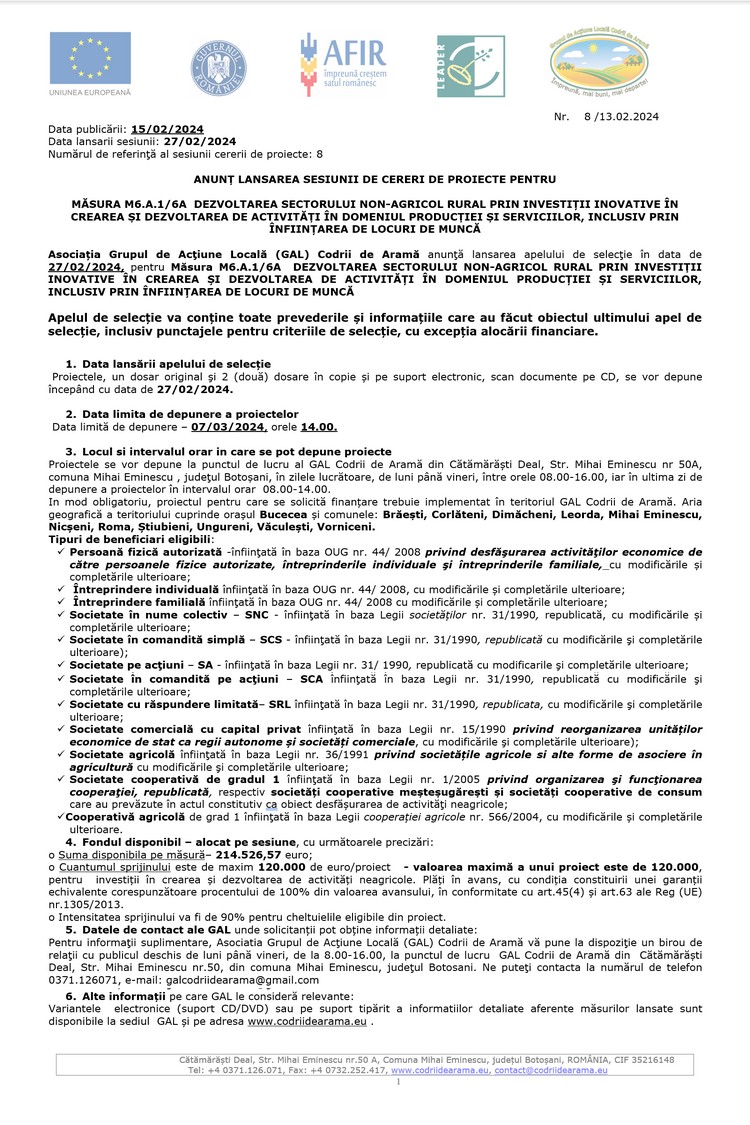 Asociația Grupul de Acţiune Locală (GAL) Codrii de Aramă anunţă lansarea apelului de selecţie în data de 27/02/2024, pentru Măsura M6.A.1/6A DEZVOLTAREA SECTORULUI NON-AGRICOL RURAL PRIN INVESTIȚII INOVATIVE ÎN CREAREA ȘI DEZVOLTAREA DE ACTIVITĂȚI ÎN DOMENIUL PRODUCȚIEI ȘI SERVICIILOR, INCLUSIV PRIN ÎNFIINȚAREA DE LOCURI DE MUNCĂ