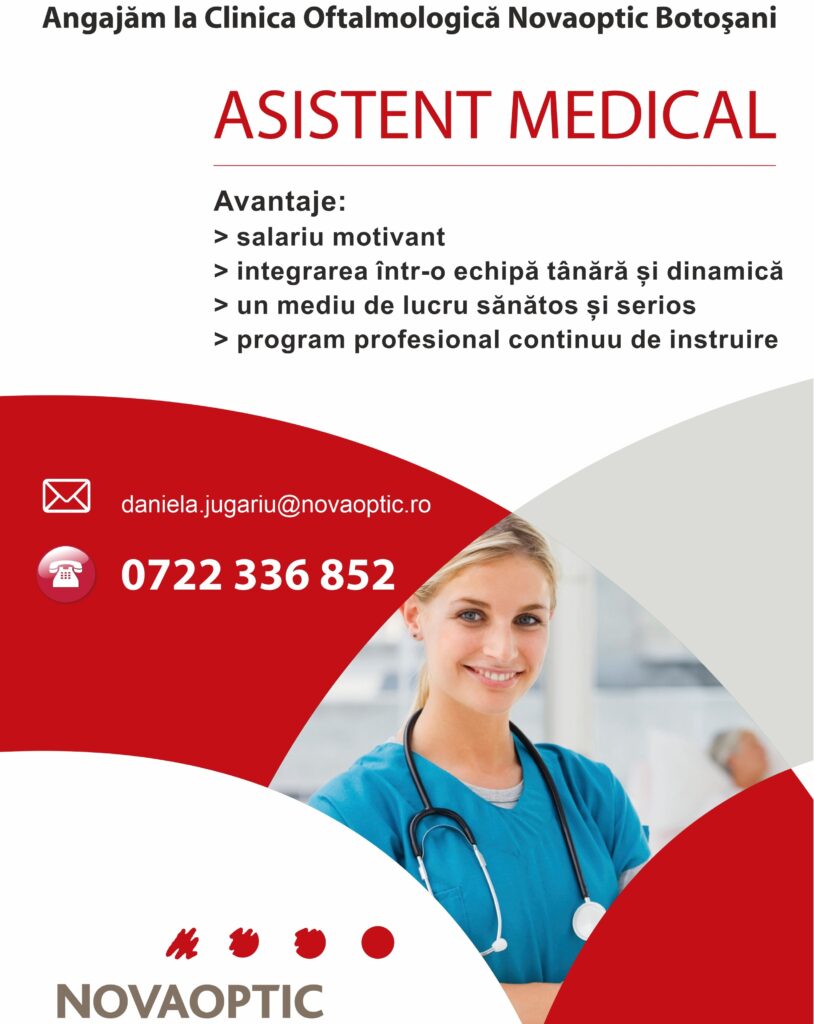 Clinica Oftalmologică Novaoptic angajează asistent medical pentru cabinetul oftalmologic din municipiul Botoșani.