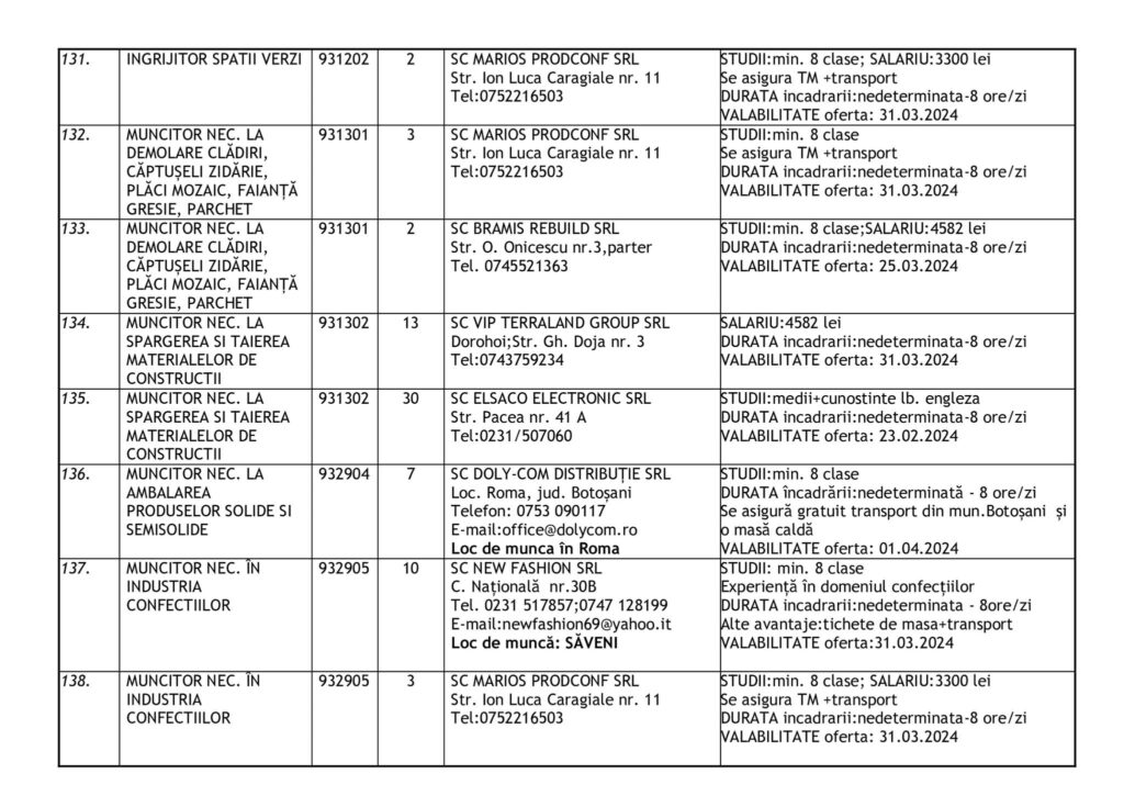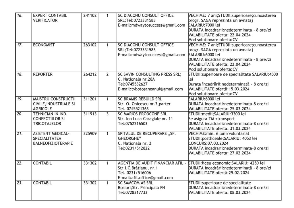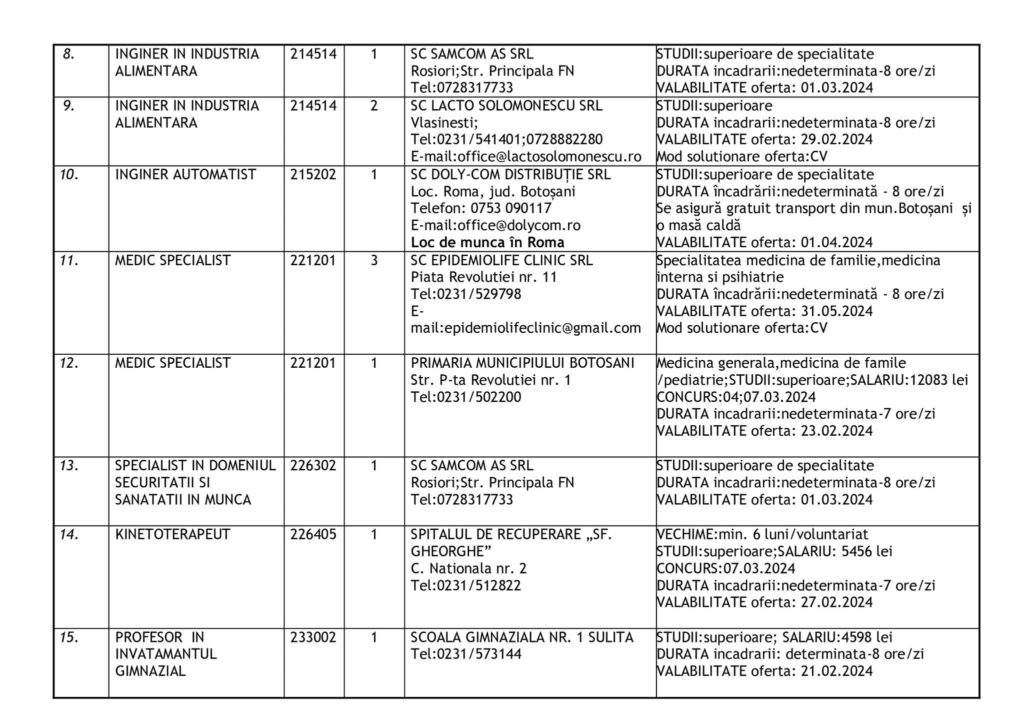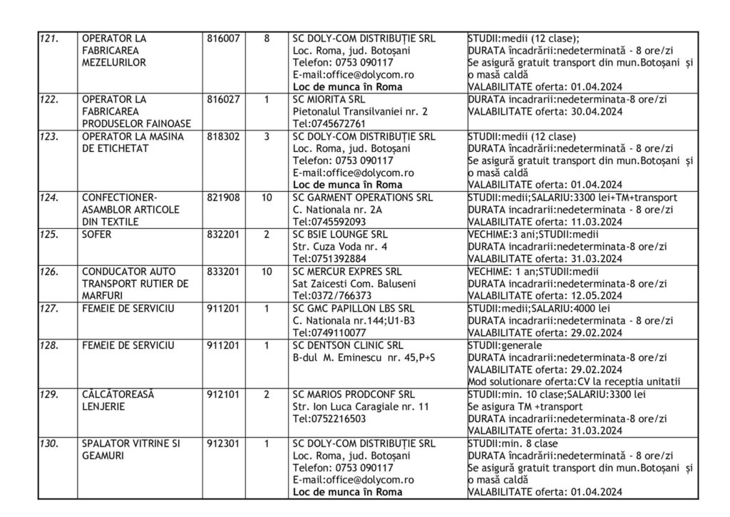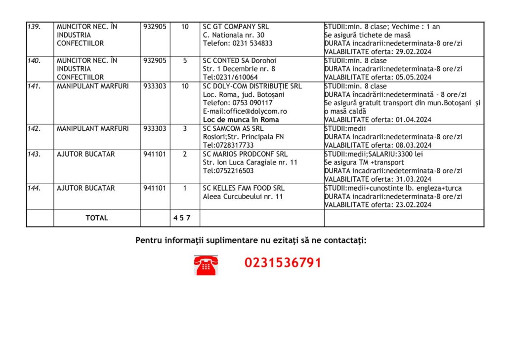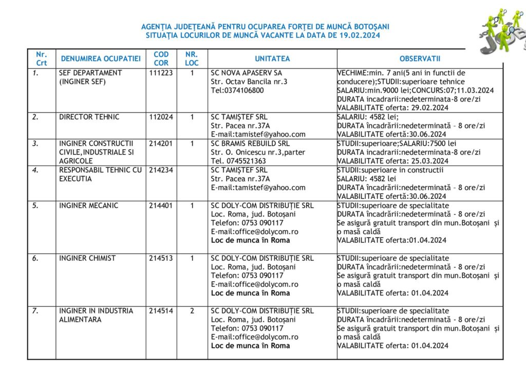 Şomerii botoşăneni pot opta pentru unul din cele 457 de locuri de muncă vacante aflate în baza de date a Agenţiei Judeţene pentru Ocuparea Forţei de Muncă, la data de 19 februarie.