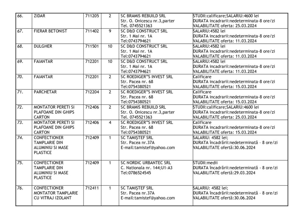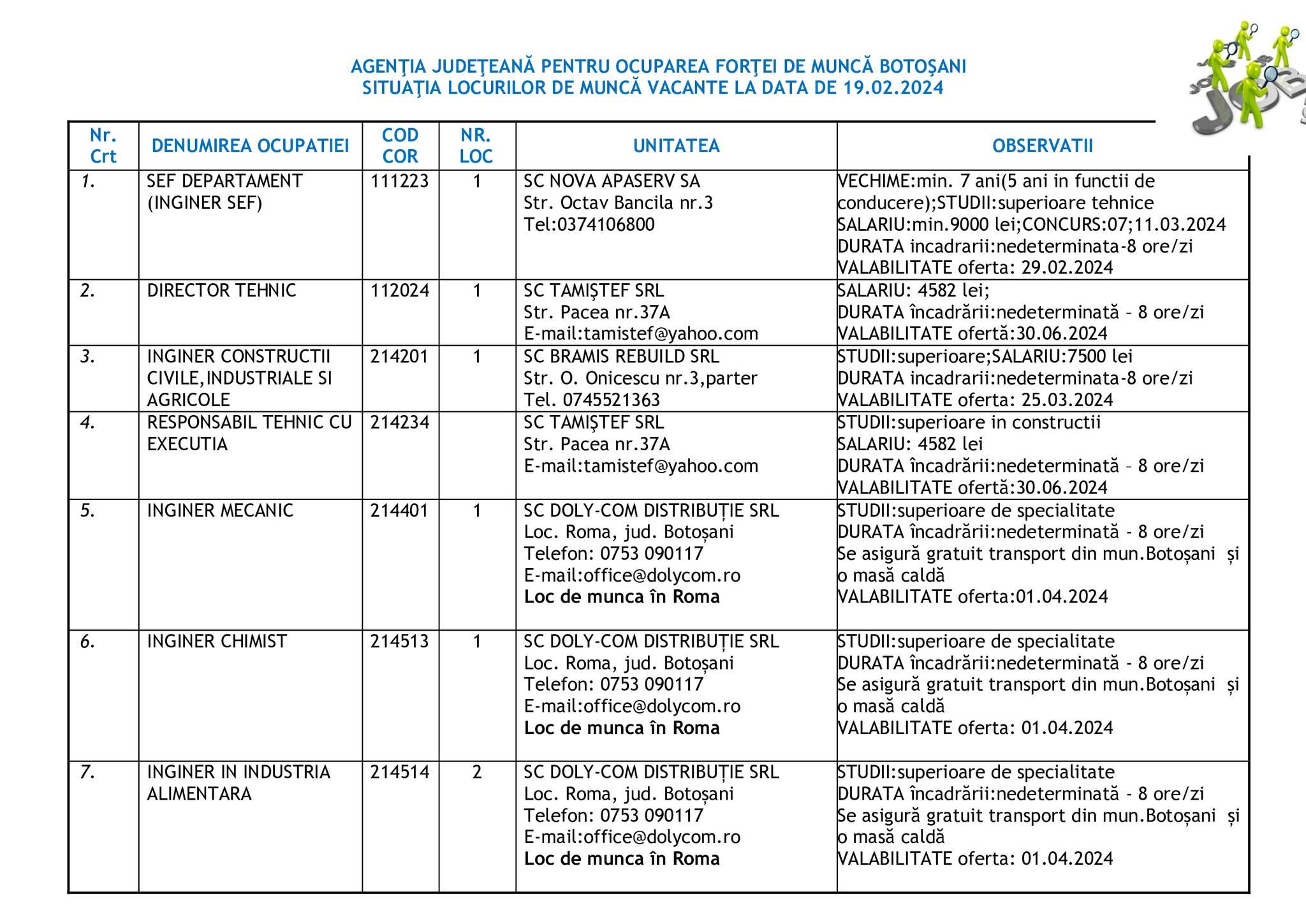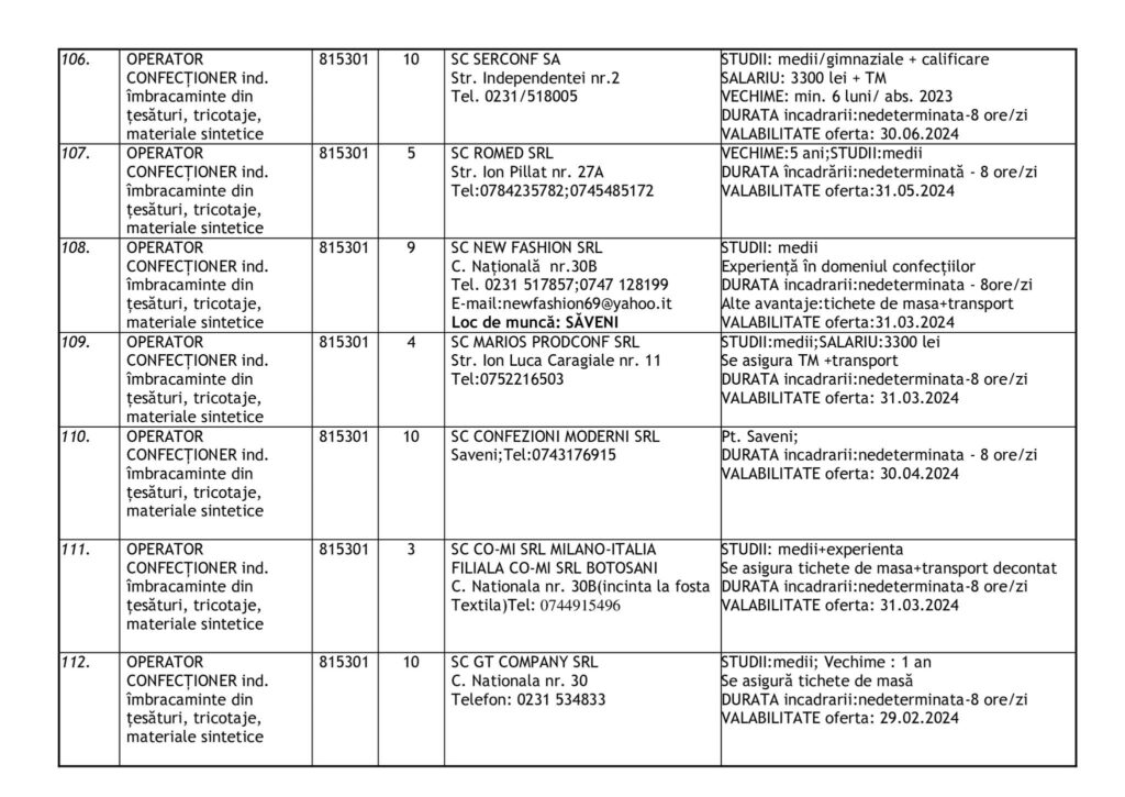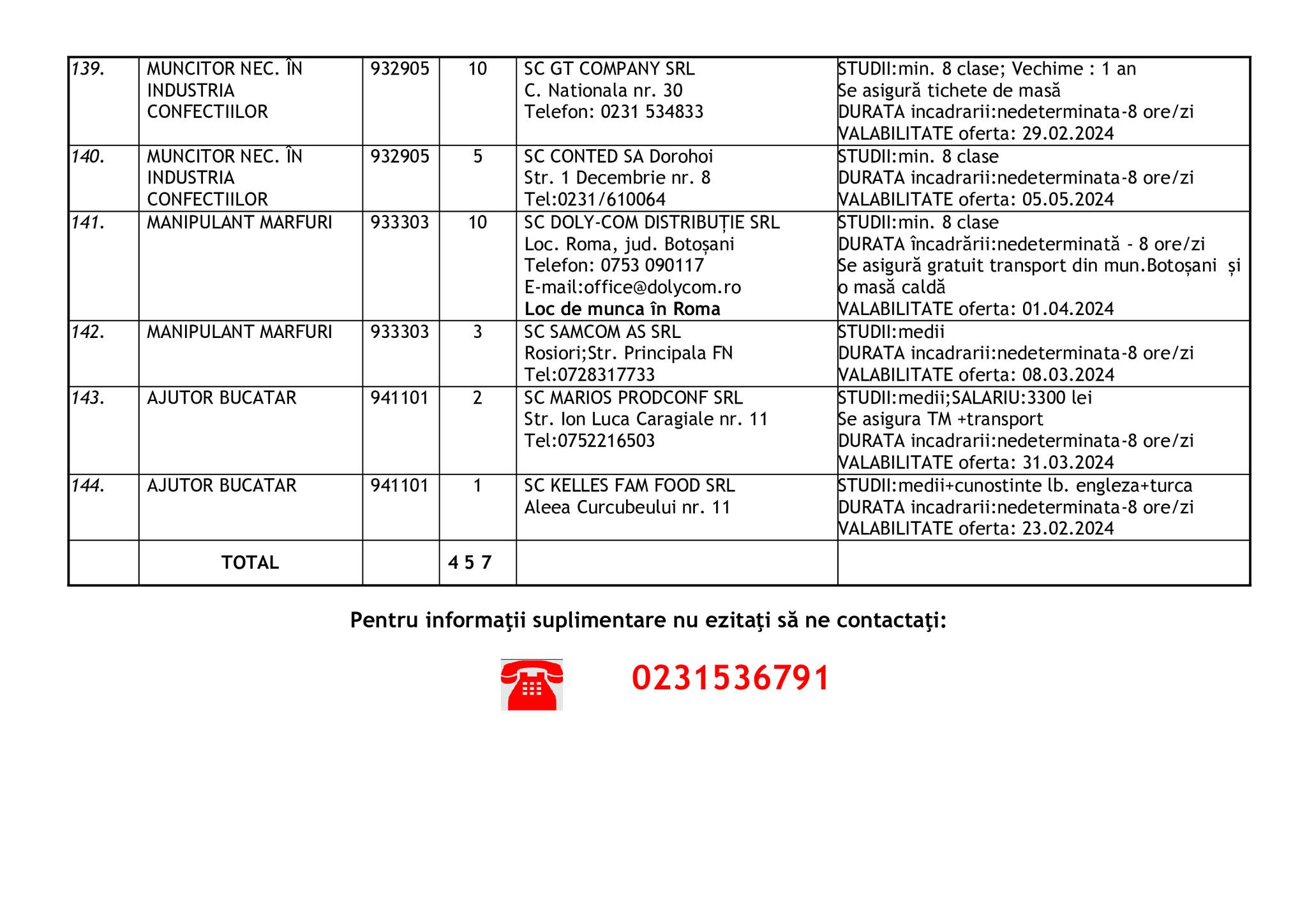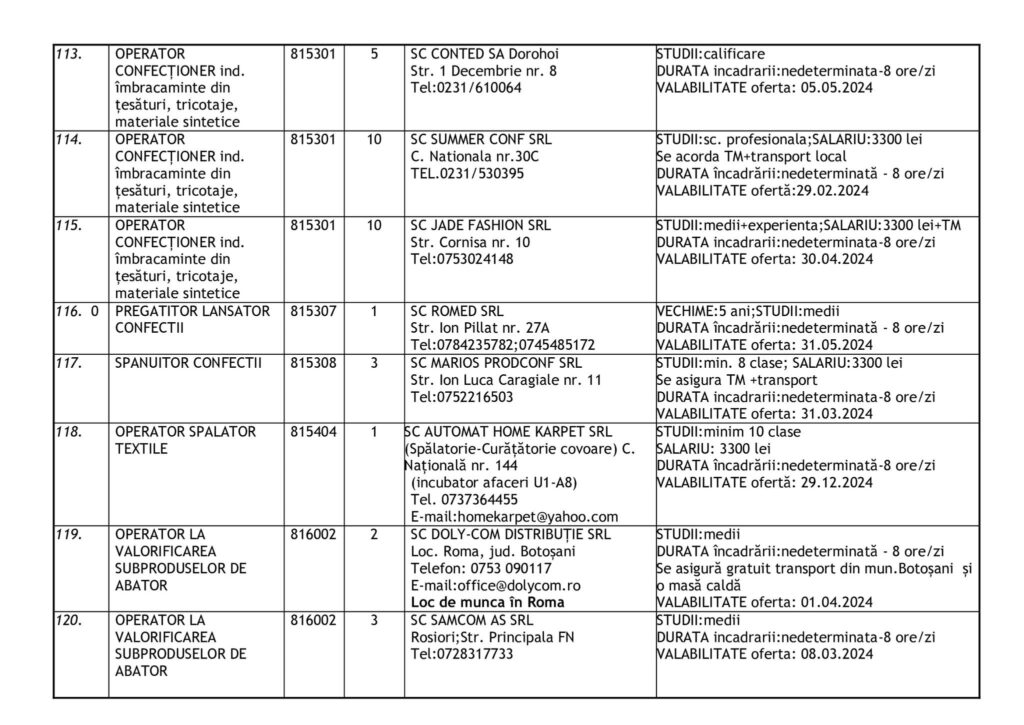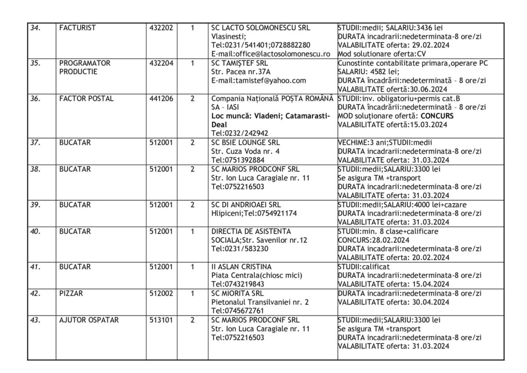Şomerii botoşăneni pot opta pentru unul din cele 457 de locuri de muncă vacante aflate în baza de date a Agenţiei Judeţene pentru Ocuparea Forţei de Muncă, la data de 19 februarie.