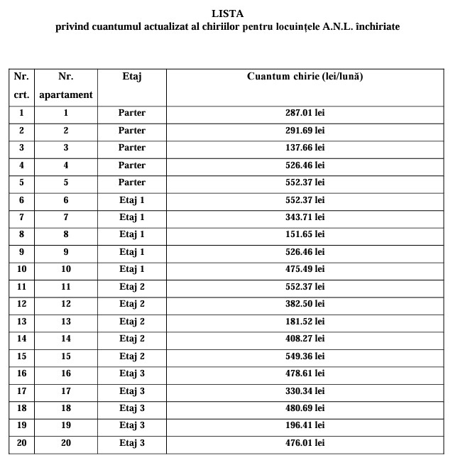 ”Chiria se actualizează anual cu rata inflației, în termen de 30 de zile de la data publicării ratei inflației comunicate de către Institutul Național de Statistică pentru anul anterior. Chiria se stabilește anual de către administratorul locuinței și se utilizează ca drept exemplu prevederile anexei 16 din hotărârea menționată, ținându-se cont de suprafețele apartamentelor, valoarea de amortizare precum și de coeficienții de pondere în funcție de localitate, an recepție al locuințelor și venitul chiriașilor. Chiria lunară rezultată după aplicarea coeficienților se ponderează în funcție de veniturile medii nete pe membru de familie ale titularului contractului de închiriere, realizate în ultimele 12 luni”, susțin reprezentanții Consiliului Județean.