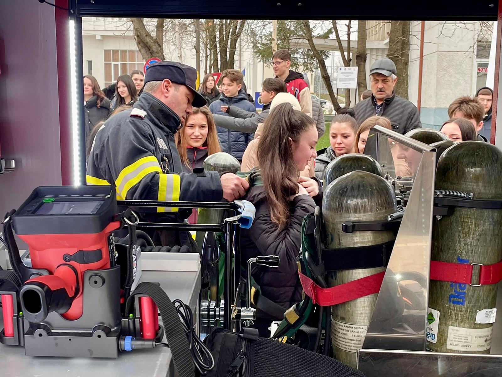 Pe pietonalul din fața Primăriei Orașului Săveni au avut ocazia să studieze cele mai noi autospeciale din dotarea ISU Botoșani: hidroperforare, pirotehnică și de descarcerare și au aflat cum se folosește fiecare accesoriu, în parte. Pe rând, copiii au probat costumul de protecție al pirotehnicienilor sau al servanților și au urcat în autospeciale.