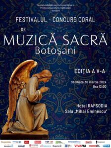 Centrul Județean pentru Conservarea și Promovarea Culturii Tradiționale Botoșani organizează în data de 30 martie 2024, în incinta Hotelului Rapsodia Botoșani, Sala ”Mihai Eminescu” cea de-a V-a ediție a Festivalului – Concurs Coral de Muzică Sacră.