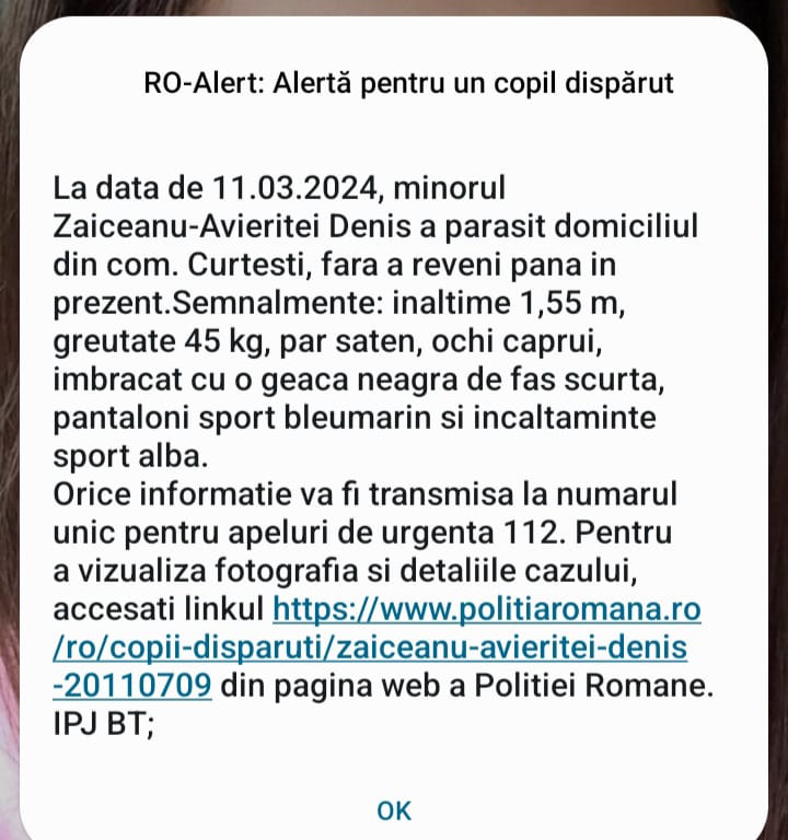 A fost emisă o alertă prin Ro-Alert în Botoșani pentru găsirea copilului dat dispărut de familie. Polițiștii botoșăneni efectuează verificări pentru localizarea unui minor, de 12 ani, din satul Orășeni Deal, comuna Curtești, care a părăsit domiciliul, luni, 11 martie, pentru a se deplasa la unitatea de învățământ din localitate, însă acesta nu a revenit la domiciliu până în prezent.