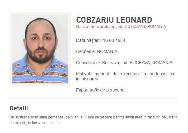 Bărbatul, care tocmai a împlinit 30 de ani, are emis pe numele său un mandat de executare a pedepsei. Botoșăneanul a fost condamnat definitiv la cinci ani și șase luni de închisoare pentru săvârșirea infracțiunii de ,,trafic de minori,, în forma continuată.