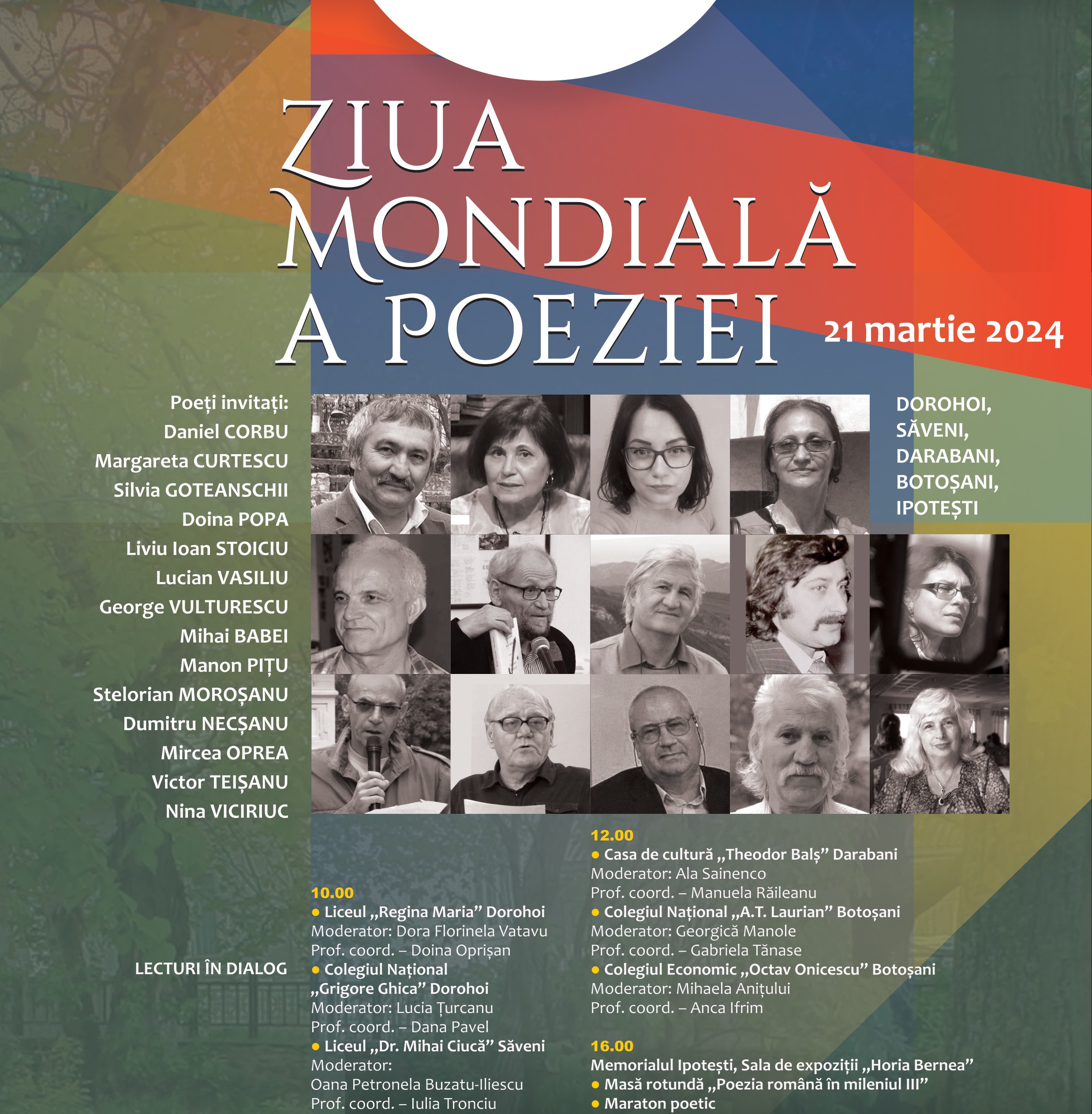 Memorialul Ipotești – Centrul Național de Studii „Mihai Eminescu”, instituție din subordinea Consiliului Județean Botoșani, organizează, pe 21 martie 2024, o serie de activități cu prilejul Zilei Mondiale a Poeziei, la care vor participa scriitorii: Liviu Ioan Stoiciu, Doina Popa (Brașov), Margareta Curtescu, Silvia Goteanschii (Chișinău), Daniel Corbu, Lucian Vasiliu (Iași), George Vulturescu (Satu Mare), Stelorian Moroșanu (Dorohoi), Victor Teișanu (Darabani), Mihai Babei, Dumitru Necșanu, Mircea Oprea, Manon Pițu, Nina Viciriuc (Botoșani).