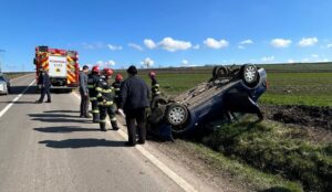 O persoană care se afla în Dacia care a ajuns cu roţile în sus a fost rănită. La faţa locului au ajuns atât pompierii, cu echipamente de descarcerare, cât şi o ambulanţă, care a acordat primul ajutor victimei.