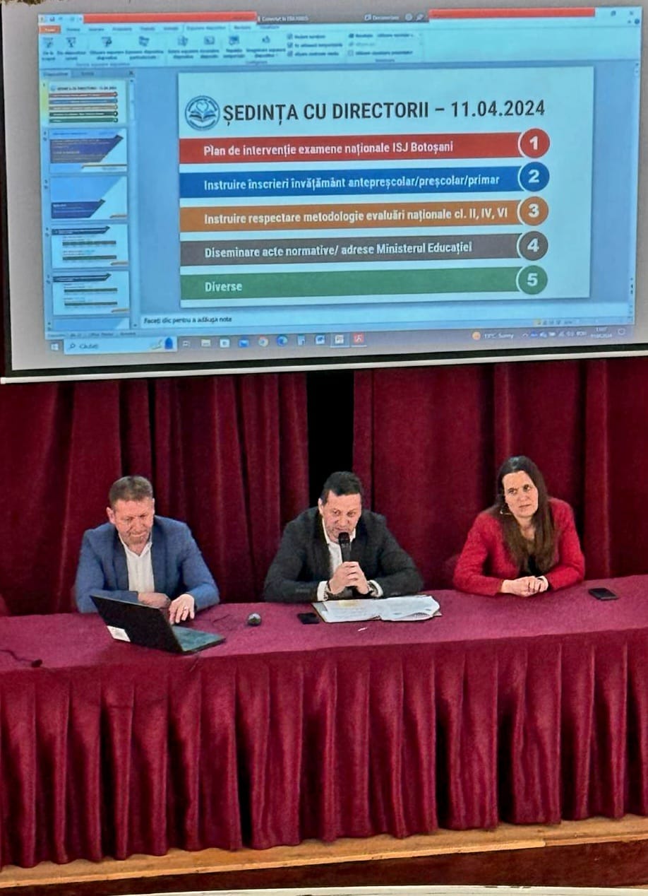 Inspectoratul Școlar Județean Botoșani a convocat la o ședință de lucru toți directorii unităților de învățământ și conexe din județul Botoșani. Activitatea s-a desfășurat în „Aula Magna” a Colegiului Național „A. T. Laurian” Botoșani joi, 11 aprilie 2024, începând cu ora 12.00.