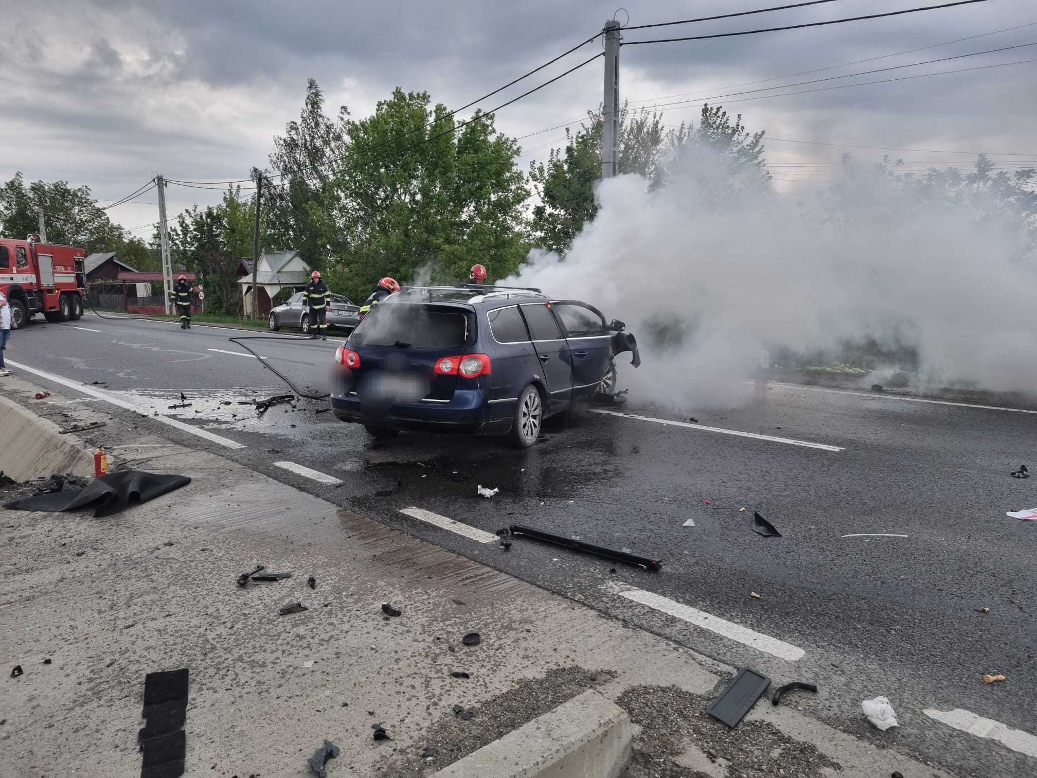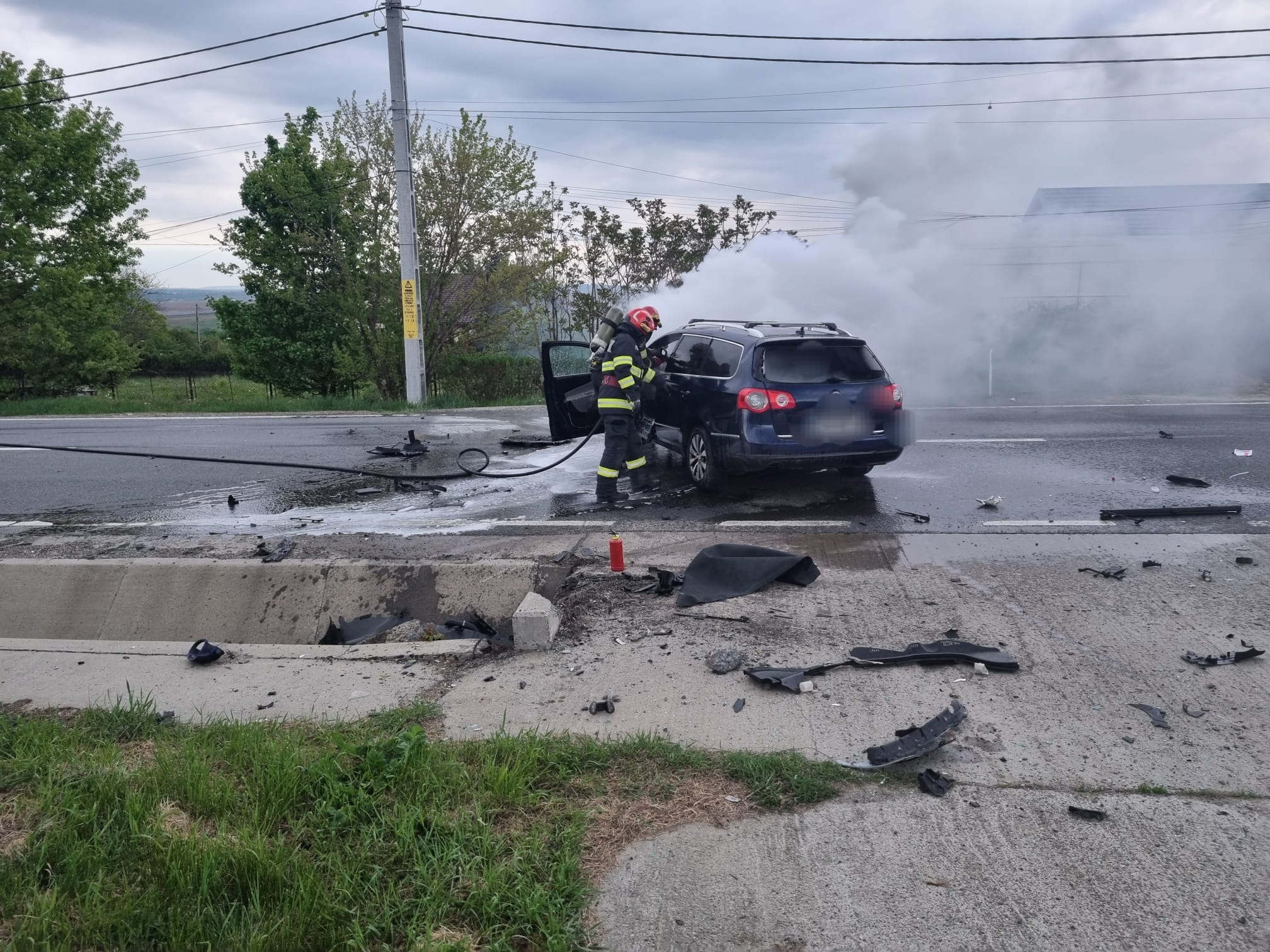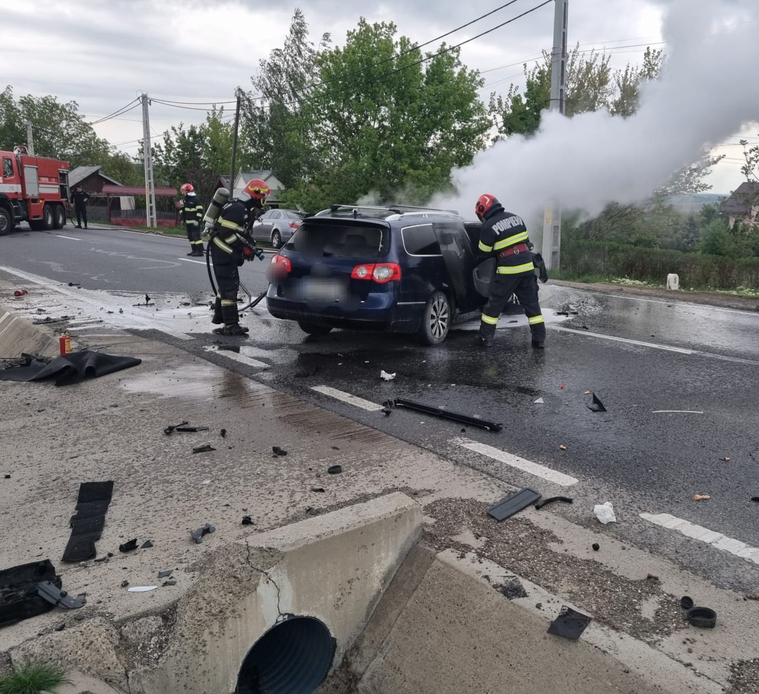 Aceștia au constatat că șoferul era ieșit din autoturism și că ardea partea din față a mașinii. Tânărul a fost evaluat la fața locului, dar a refuzat transportul la spital.