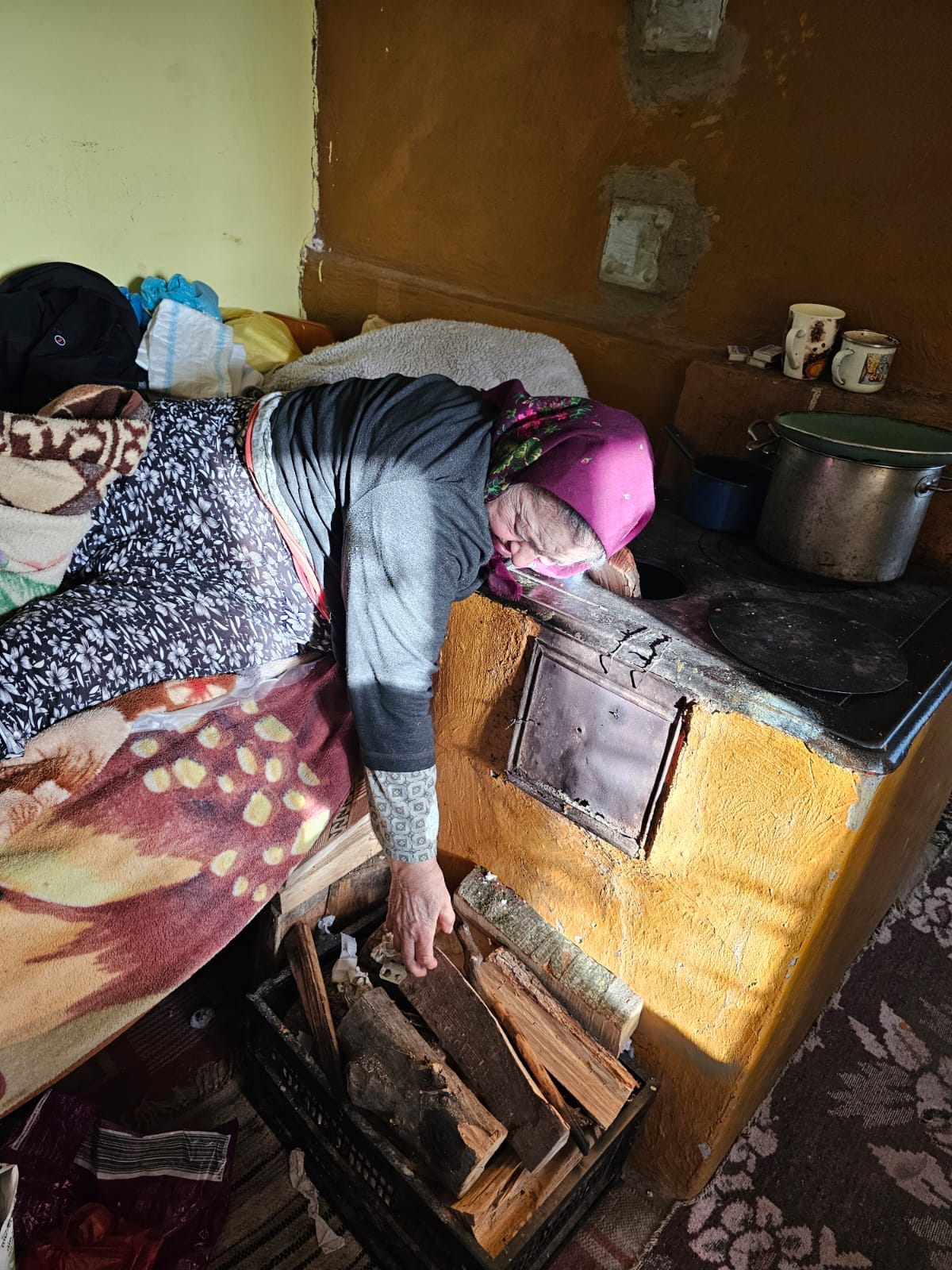 „Mi-a spus ca de luni de zile n-a vazut lumina zilei pe geam. Am ramas uimita, pentru ca patul d-nei este lipit de geam…Am dat draperia deoparte si am constatat ca geamul este extrem de subred, „chituit” cu niste carpe si acoperit cu patura atat pe interior cat si pe exterior pentru ca frigul de afara sa nu patrunda atat de repede. Casuta batranei are o singură cameră, despartita pe mijloc de o sobă subredă, pe care bunica se chinuie, singura, sa puna lemne pe foc. Patul pe care este imobilizata nu se poate numi pat. Este de fapt o saltea de pat, suspendată pe niște lemne, peste care este pus un placaj, un ceolofan si apoi niste paturi si iar ceolofan… Bunica sta non stop pe acest placaj tare, acoperit cu o patura. Sta mereu cu stres ca se poate rasturna oricand ” patul” tot cu dansa, mai ales cand pune singura lemne pe foc”, spune preotasa.