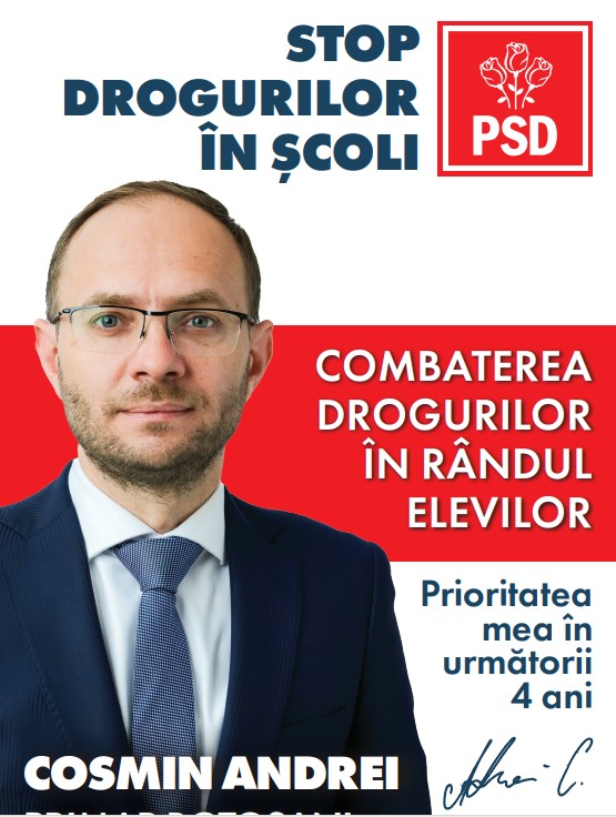 Primarul Municipiului Botoșani, Cosmin Andrei, consideră că prevenirea și combaterea consumului de droguri în rândul elevilor trebuie să fie o prioritate a viitoarei administrații municipale. Edilul susține că, în urma numeroaselor discuții cu părinții care au copii de vârstă școlară, a constatat că există o îngrijorare foarte ridicată față de riscurile la care sunt expuși elevii, în contextul intensificării traficului de droguri la nivel național. Copiii și adolescenții de vârstă școlară reprezintă categoria cea mai vizată de către traficanți și de aceea Primăria trebuie să se implice pentru prevenirea și combaterea drogurilor în rândul elevilor.