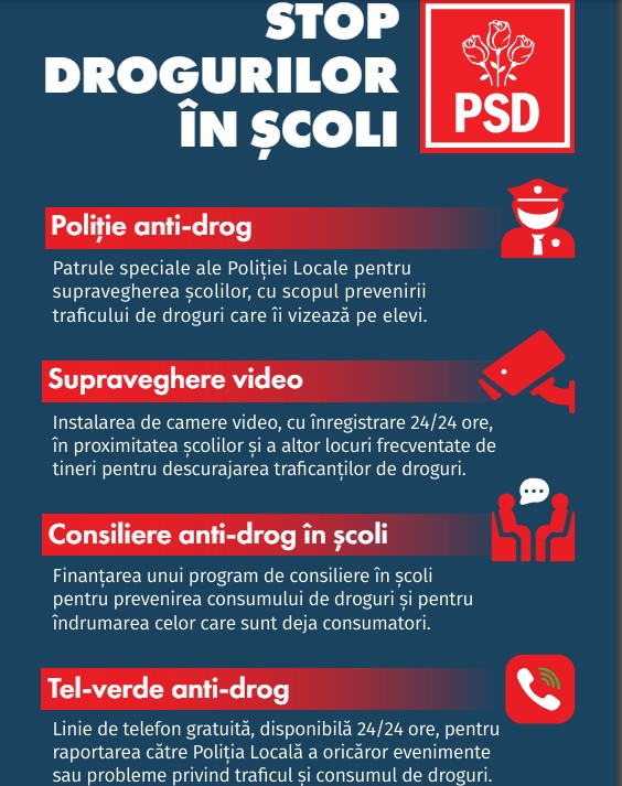 Primarul Cosmin Andrei a explicat că programul său va avea două componente majore: una combativă îndreptată împotriva traficanților de droguri și una preventivă și de sprijin pentru elevii care ar putea deveni sau sunt deja victime ale acestui flagel.