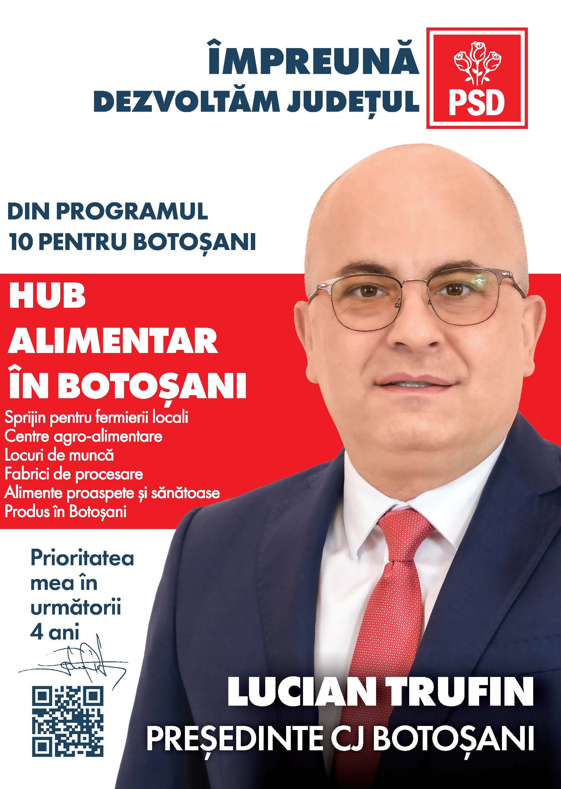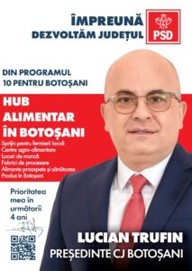 Unul dintre proiectele principale din Programul 10 pentru Botoșani propus de Lucian Trufin, candidatul PSD pentru funcția de președinte al Consiliului Județean, are în vedere sprijinirea producției agroalimentare locale, astfel încât produsele fermierilor botoșăneni să fie valorificate în mod prioritar pe piața din județul Botoșani.