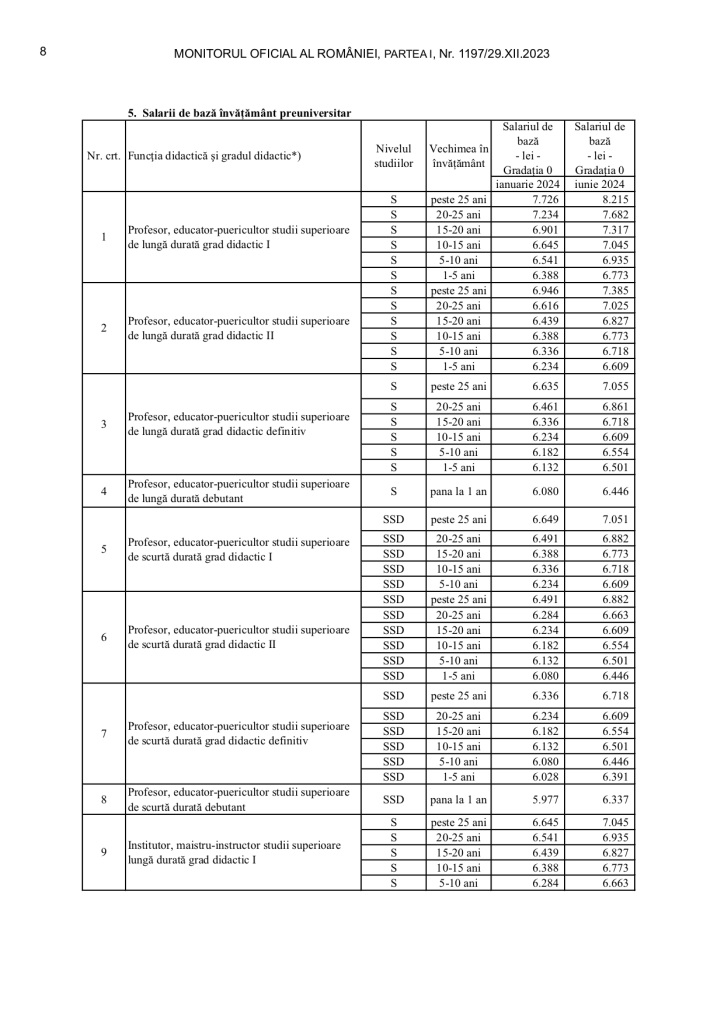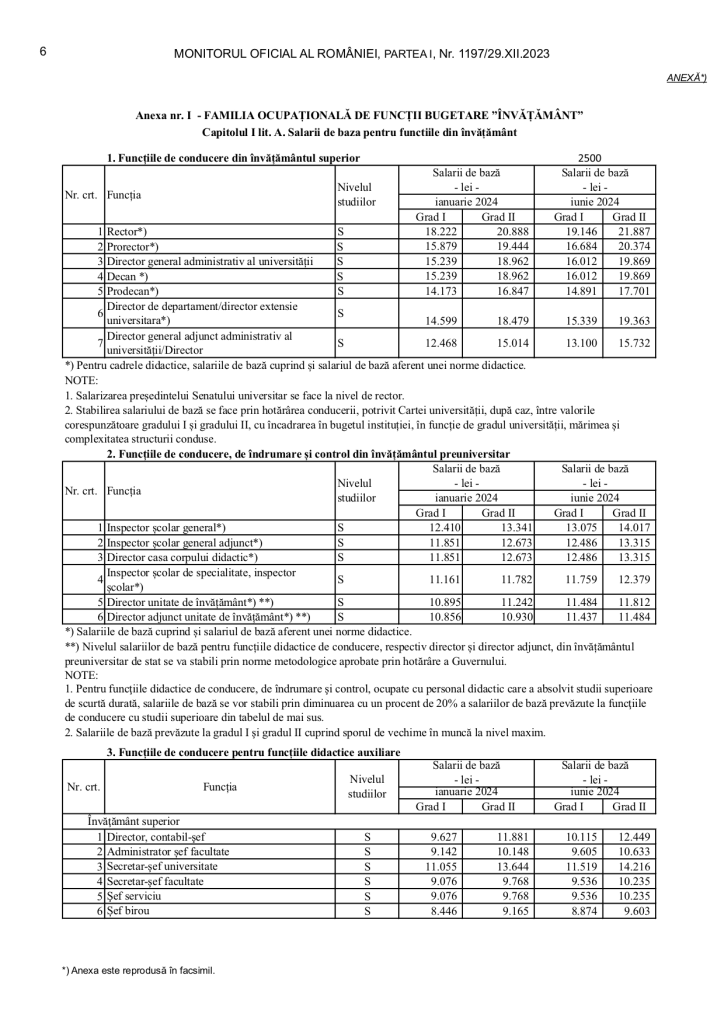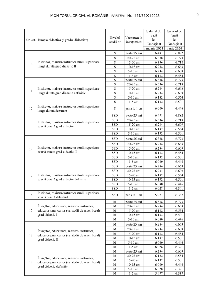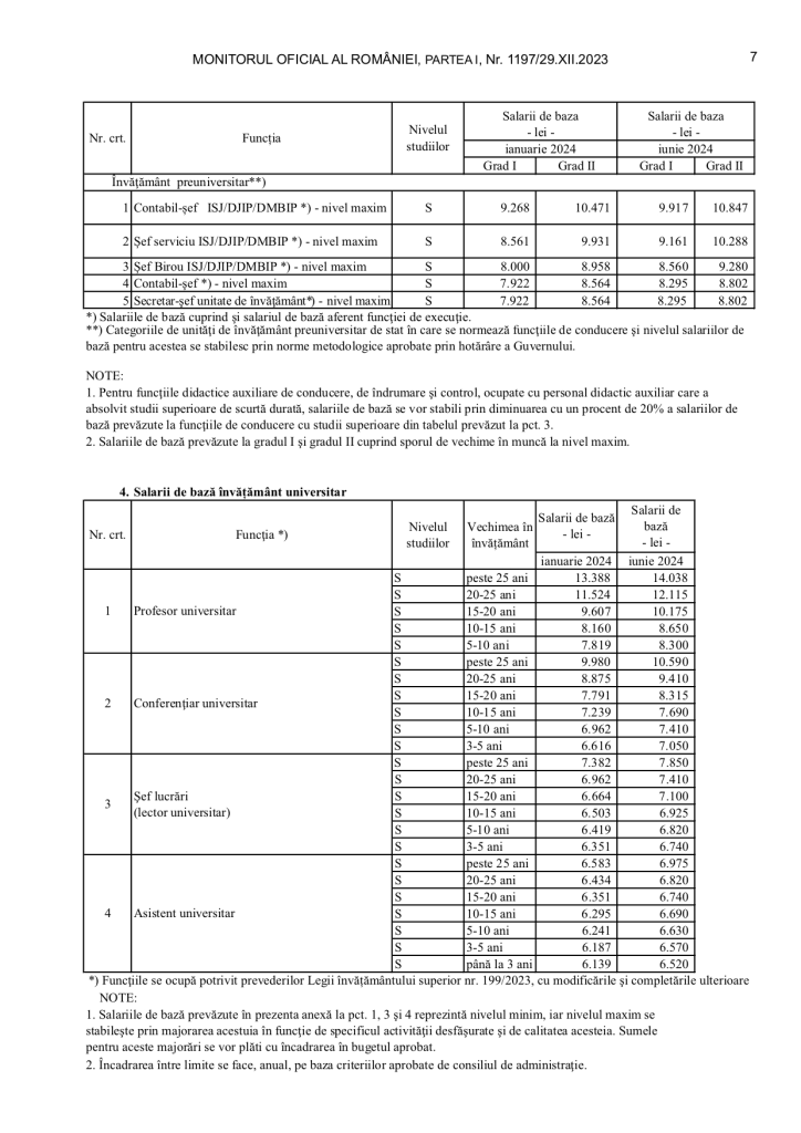 Grilele publicate sunt referitoare la salariile de bază brute, echivalente pentru gradația 0, pe fiecare funcție, tranșă de vechime și grade didactice.