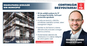 „Sunt părinte și știu cât de important este pentru copiii noștri să aibă cele mai bune condiții la clasă, atât din punct de vedere al spațiilor din școli, cele mai bune condiții de igienă, curățenie, și confort, cât și al dotărilor de care dispun respectiv laboratoare dotate, table inteligente, echipamente IT noi. Ați fost alături de mine, v-am ascultat preocupările și am găsit soluții împreună. În ultimii ani am finalizat multe proiecte în municipiul Botoșani, dar cel mai important, care este în defășurare și va continua este programul de reabilitare și cel de dotare al școlilor din municipiu”, a precizat Cosmin Andrei.