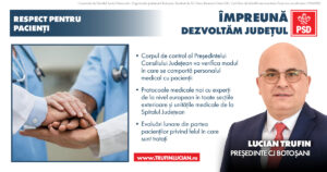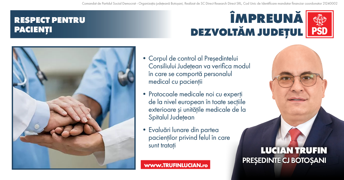 Candidatul PSD pentru funcția de președinte al Consiliului Județean Botoșani, Lucian Trufin afirmă că programul său „Respect pentru pacienți” va asigura implementarea celor mai riguroase proceduri și protocoale medicale pentru tot personalul sanitar și auxiliar de la toate unitățile spitalicești coordonate de către Consiliul Județean Botoșani. Aceste reguli vor fi stabilite împreună cu reprezentanții medicali și vor fi monitorizate și evaluate permanent de Consiliul Județean.