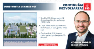 Administrația Cosmin Andrei a reușit să construiască și să deschidă prima creșă nouă în municipiul Botoșani din ultimii 34 de ani. Este vorba de creșa din cartierul ANL Cișmea, care a fost deschisă începând cu anul școlar 2023-2024.