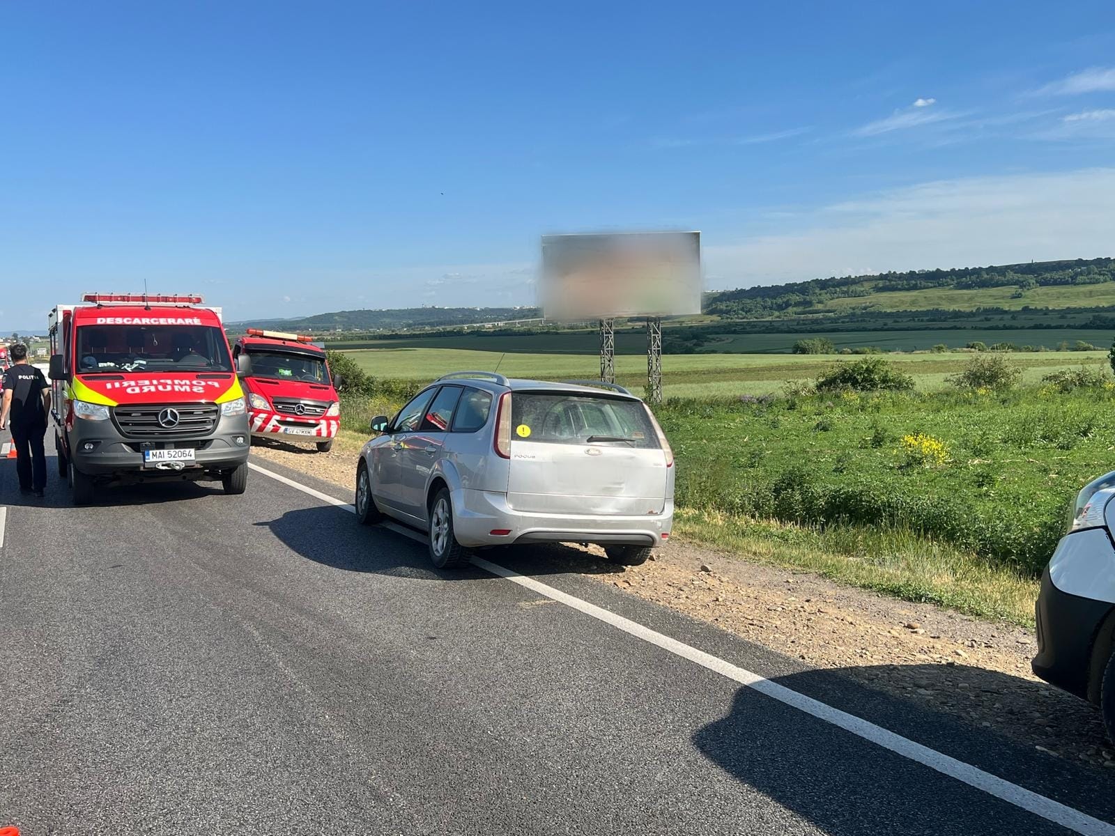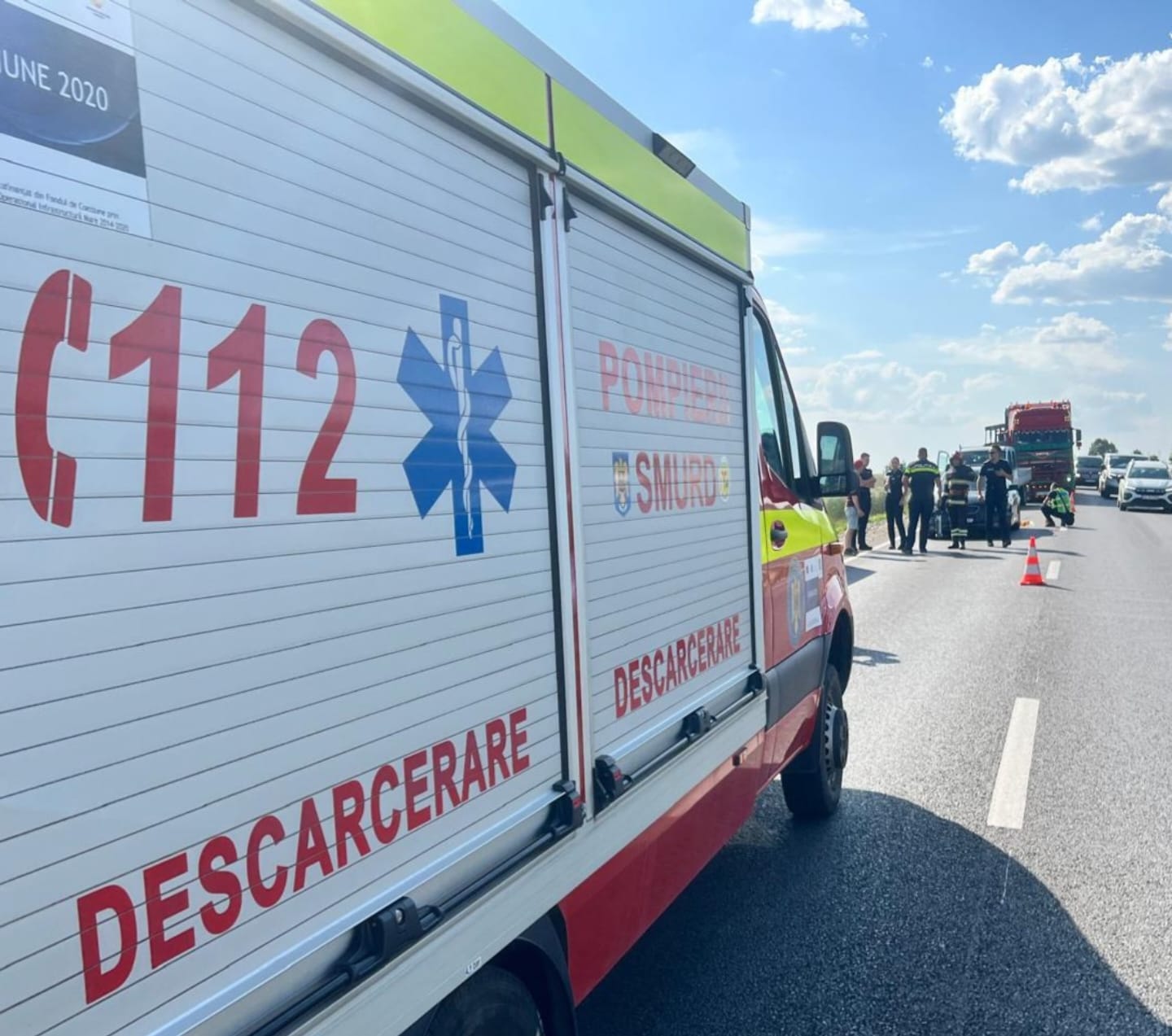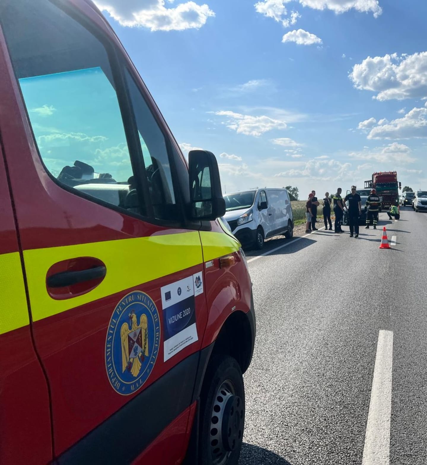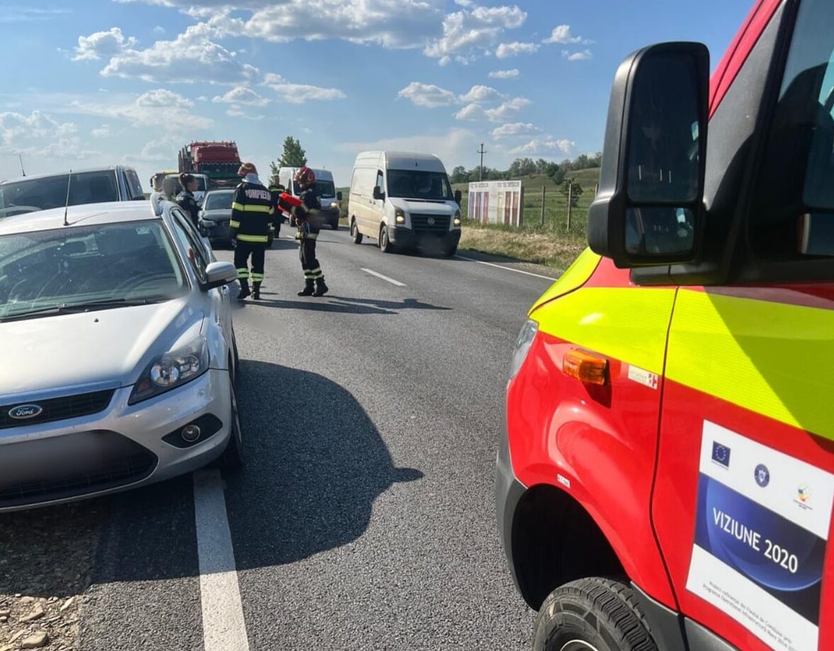 Au intervenit pompierii militari, cu o autospeciala pentru descarcerare și o ambulanta SMURD. In evenimentul rutier au fost implicate doua autoturisme, doua autoutilitare si un autotren.