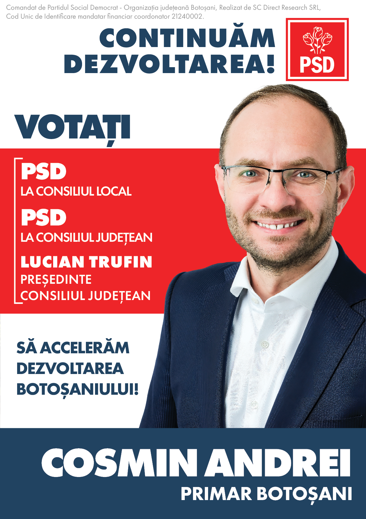 „Am venit în fața botoșănenilor cu cea mai competentă și onestă echipă pentru viitorul Consiliu Local 2024-2028, care să fie alături de mine pentru a finaliza proiectele și programele aflate în desfășurare și pentru a le începe pe cele deja prezentate ca să contiuăm dezvoltarea orașului nostru. Vă rog să votați PSD la Consiliul Local Botoșani și PSD la Consiliul Județean Botoșani, Lucian Trufin Președinte al Consiliului Județean Botoșani pentru accelerarea proiectelor municipiului în următorii 4 ani. Avem nevoie de o majoritate stabilă ca să finalizăm și mai multe proiecte pentru botoșăneni în mandatul care urmează”, a declarat Cosmin Andrei.