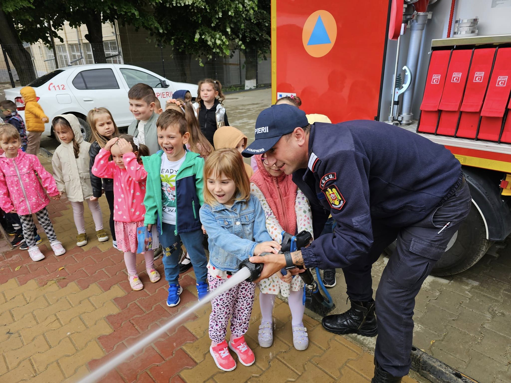 Autospeciala de intervenție a fost, însă, punctul de atracție. Copiii au avut ocazia să probeze echipamentele de protecție folosite de pompieri în misiunile operative și au testat presiunea furtunelor ca și când ar fi stins un incendiu.