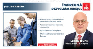 „E un lucru bun atunci când programele pe care le propunem pentru dezvoltarea județului nostru sunt preluate în presa națională. Pe lângă faptul că e un fel de validare a propunerilor noastre social-democrate, cred că e foarte bine atunci când știrile naționale prezintă și lucruri bune despre județul Botoșani, așa cum e școala de meserii pe care am reușit să o înființez la Vlăsinești. Și dacă vom realiza mai multe astfel de școli de meserii, iar tinerii botoșăneni vor putea câștiga un salariu bun aici, acasă, atunci cred că județul nostru se va remarca la nivel național ca un model de succes pentru oprirea plecării tinerilor la muncă în străinătate”, a explicat candidatul PSD pentru președinția Consiliului Județean Botoșani.