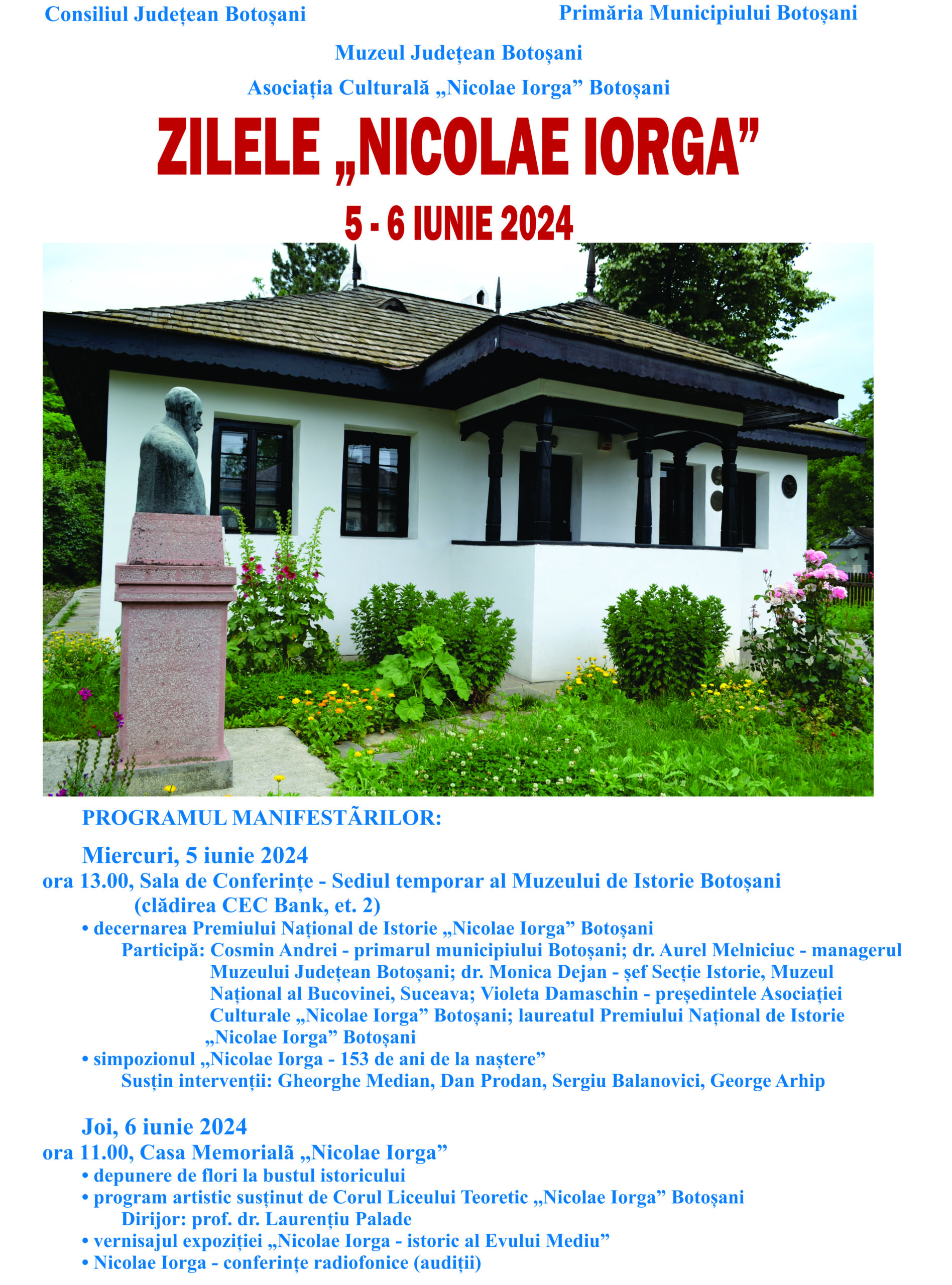 Muzeul Judeţean Botoşani organizează, în zilele de 5 şi 6 iunie 2024, manifestările dedicate împlinirii a 153 de ani de la nașterea lui Nicolae Iorga.