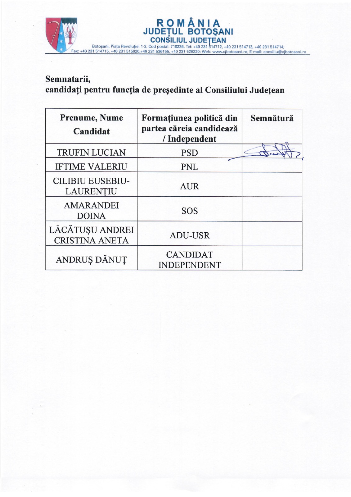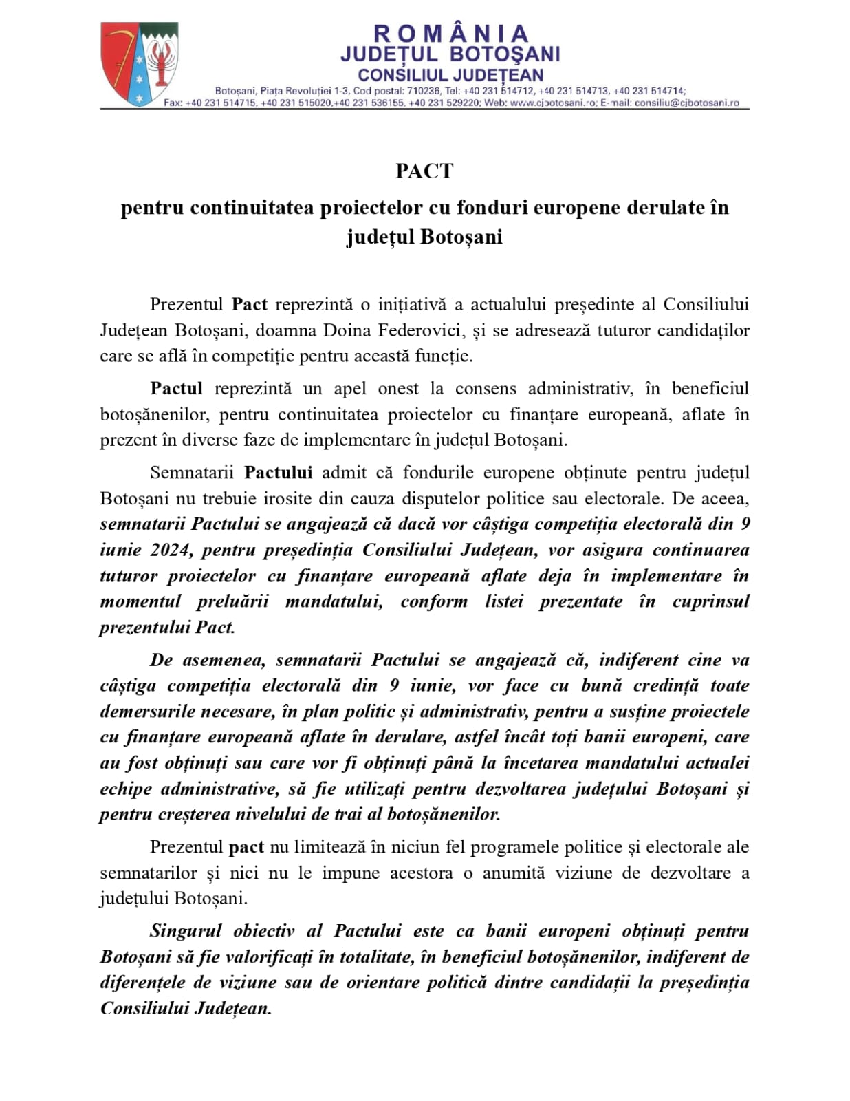 Candidatul PSD pentru funcția de președinte al Consiliului Județean, senatorul Lucian Trufin, a anunțat că a semnat Pactul propus de actuala șefă a Consiliului Județean Botoșani, Doina Federovici. În același timp, Lucian Trufin îi invită și pe ceilalți candidați să se alăture demersului său și să se angajeze în fața botoșănenilor că vor susține proiectele cu fonduri europene demarate de actuala administrație.