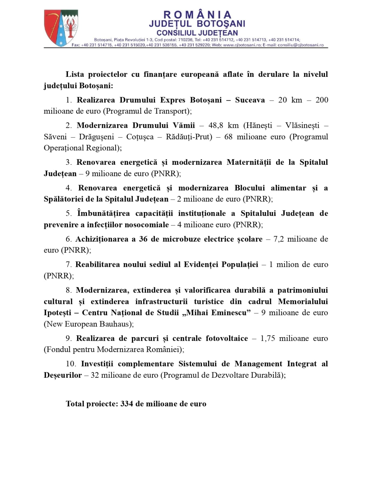 Cum a spus și doamna președinte a Consiliului Județean Botoșani, aici nu e o chestiune de orgoliu sau de competiție electorală. E vorba de bani europeni deja obținuți pentru județul nostru prin munca doamnei Doina Federovici. Tot ce trebuie să facem e să ducem proiectele la bun sfârșit pentru a deconta fondurile europene care ne-au fost deja alocate. Cunosc bine aceste proiecte pentru că le-am discutat în amănunt cu doamna președinte a Consiliului Județean. Nu e nimic politic în ele. Sunt investiții în drumuri, investiții în sănătate, în educație și alte obiective importante”, susține candidatul PSD pentru șefia Consiliului Județean.
