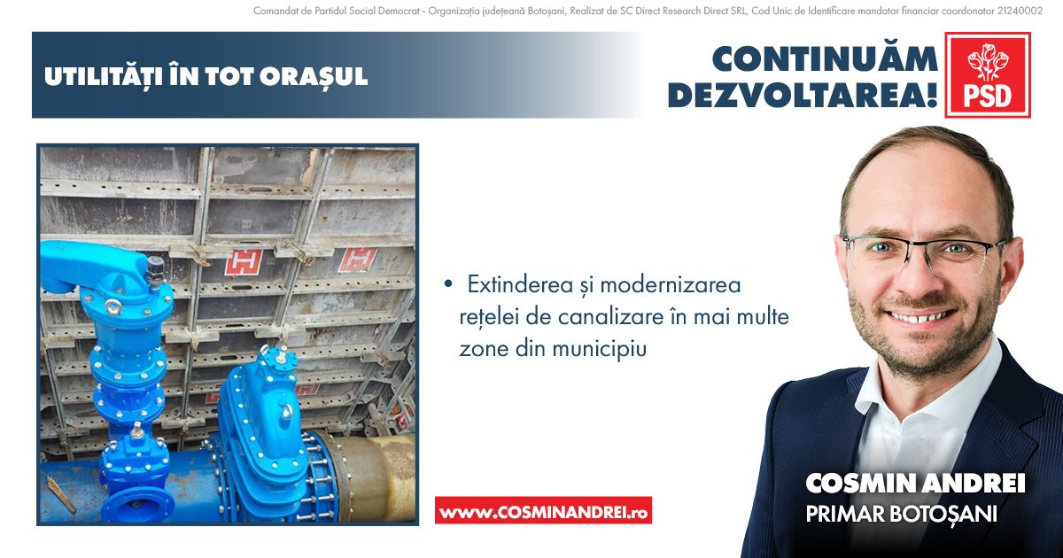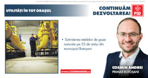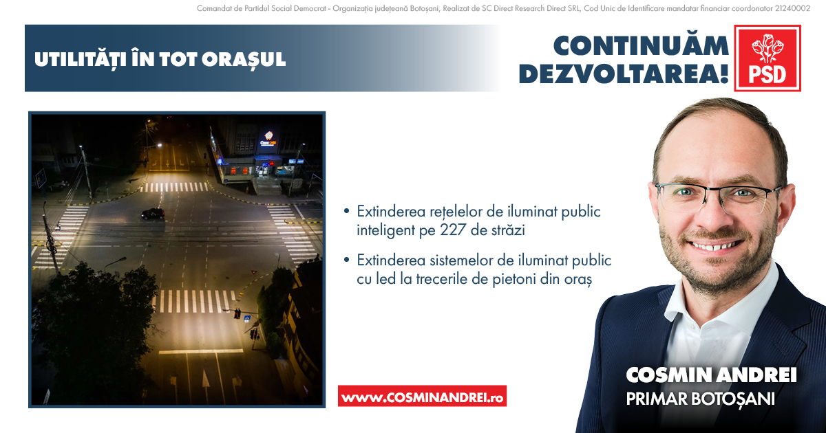 „Voi continua investițiile în extinderea rețelelor de iluminat public inteligent pe încă 227 de străzi din municipiul Botoșani, inclusiv montarea de sisteme de iluminare moderne și de capacitate mai mare a trecerilor de pietoni din oraș. În același timp avem deja proiectul și alocarea financiară pentru extinderea rețelelor de gaze natuale pe 55 de străzi. Totodată vom crește investițiile în dezvoltarea și modernizarea rețelei de canalizare în mai multe zone din municipiu”, a declarat Cosmin Andrei.