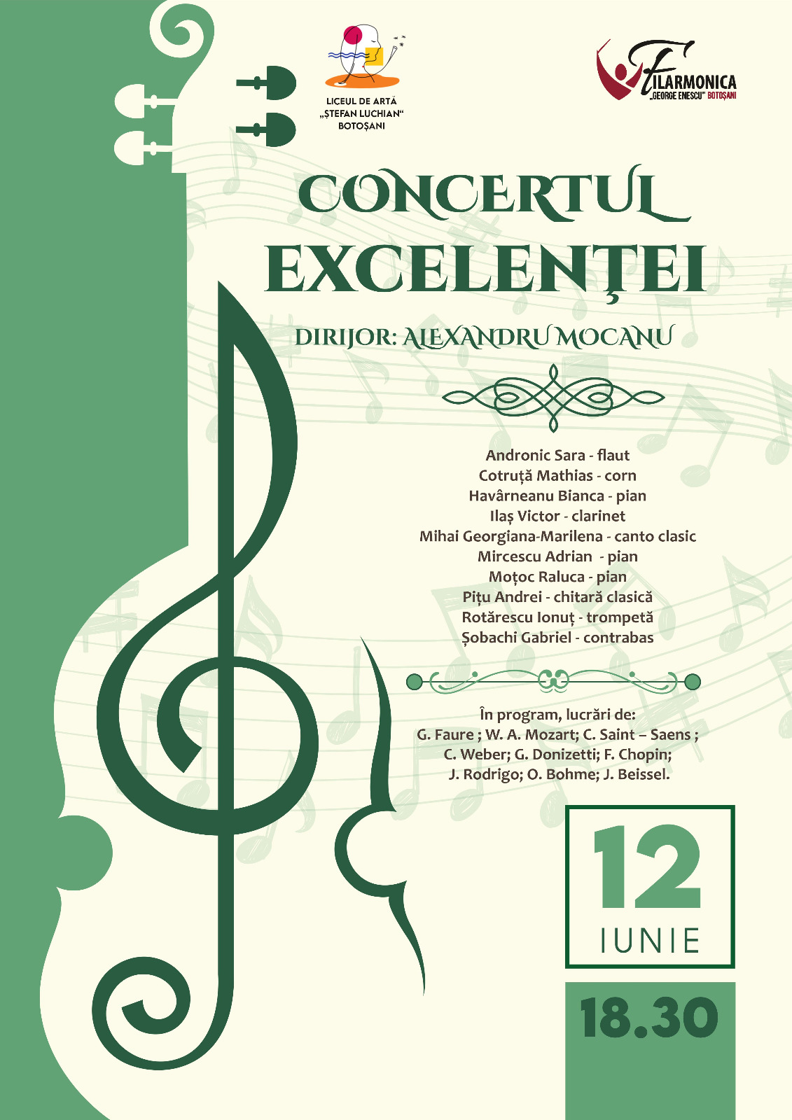 Fiindcă muzica este cel mai desăvârşit translator al vibraţiei sufletului omenesc, Liceul de Artă „Ştefan Luchian” din Botoşani şi Filarmonica „George Enescu” Botoşani organizează Concertul Excelenței, care va avea loc miercuri, 12 iunie 2024, ora 18.30, la Casa de Cultură a Sindicatelor.
