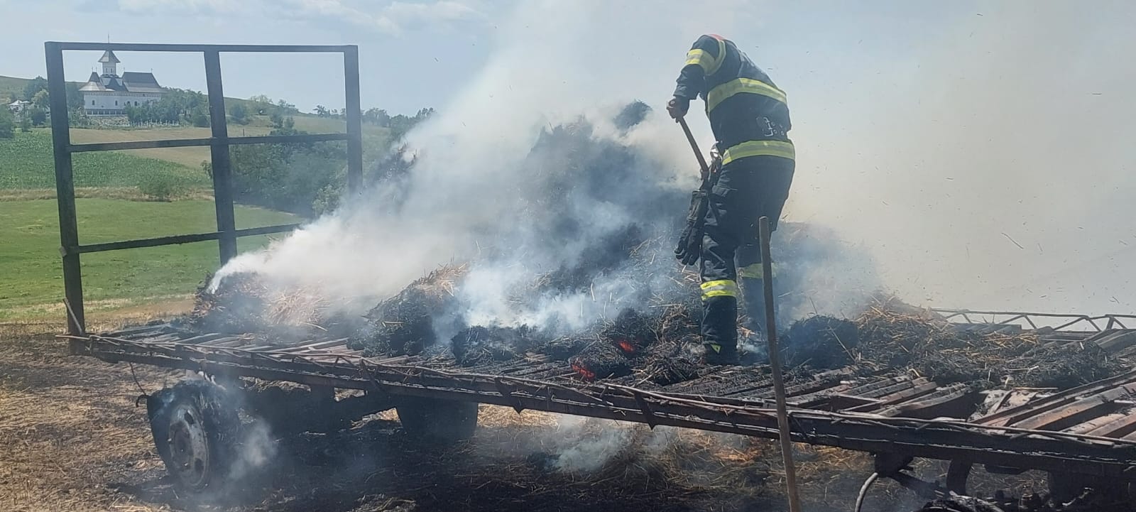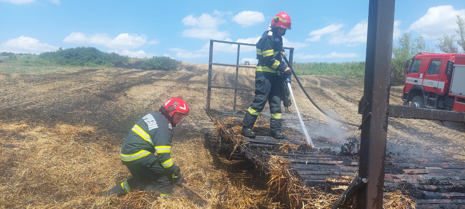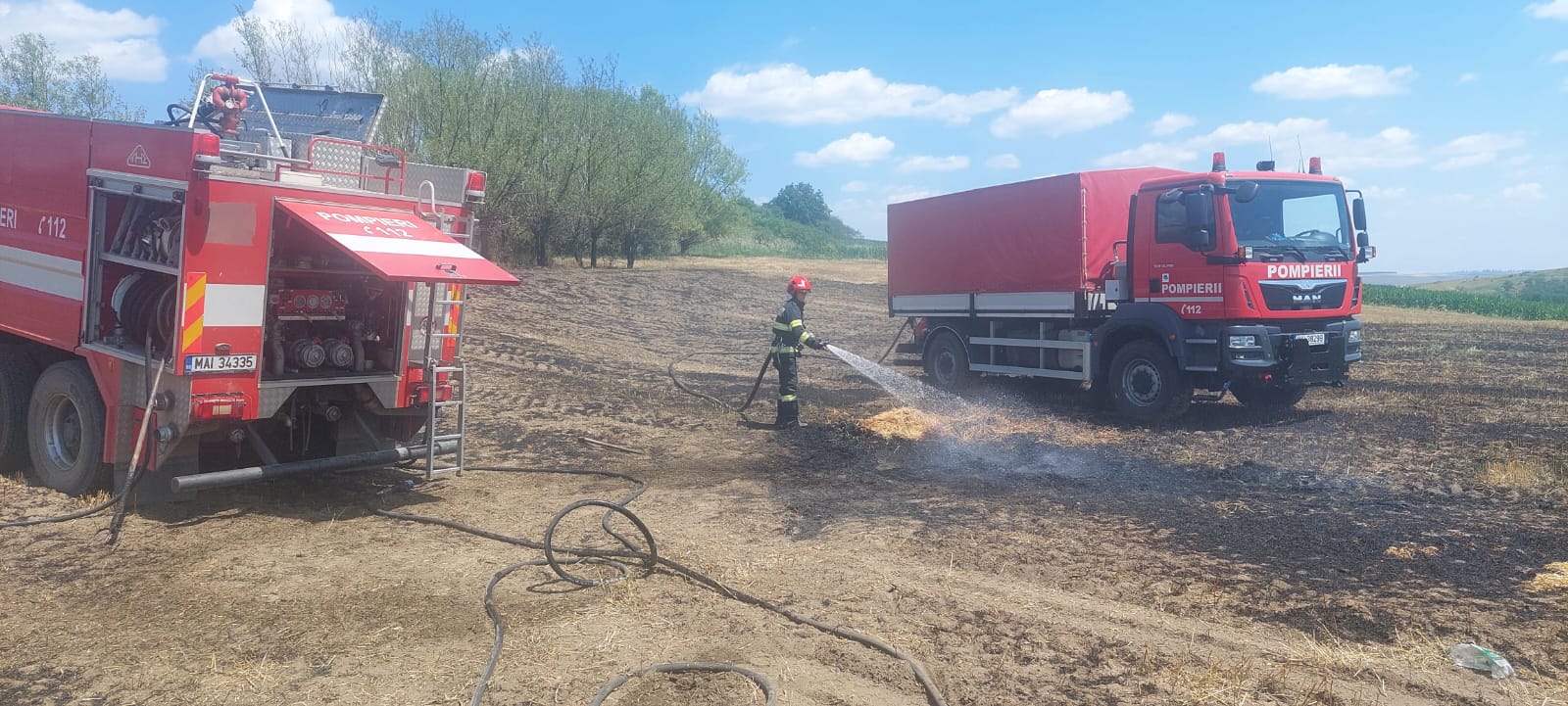 Alarma a fost dată chiar de șoferul balotierei. Până la sosirea pompierilor, acesta a reușit să îndepărteze utilajul agricol din zona de pericol.