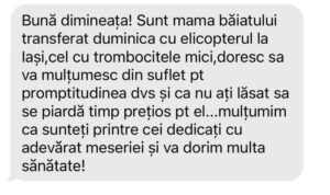 „Mesajele de acest fel îmi amintesc de ce am ales această profesie și îmi dau puterea să continui să mă dedic cu pasiune fiecărui pacient. Mulțumesc pentru încrederea și recunoștința dumneavoastră! Și mulțumim mai ales mentorilor noștri din cadrul Clinicii Oncologie-Hematologie și Nefrologie Pediatrica Iași!”, a transmis medicul.