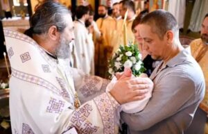 Pruncul Rafail a fost însoțit de nașii Mihai și Anișoara, care au venit din Dublin pentru a participa la încreștinarea copilului.