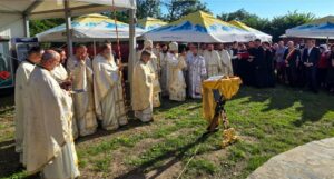 În continuare, cei prezenți au luat parte la Sfânta Liturghie săvârșită de Înaltpreasfinţitul Părinte Teodosie, Arhiepiscopul Tomisului, și de Preasfințitul Părinte Nichifor Botoșăneanul pe un podium amenajat în curtea sfântului locaș.
